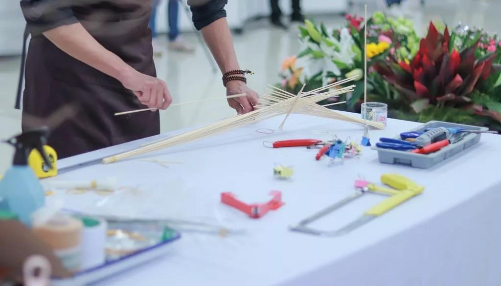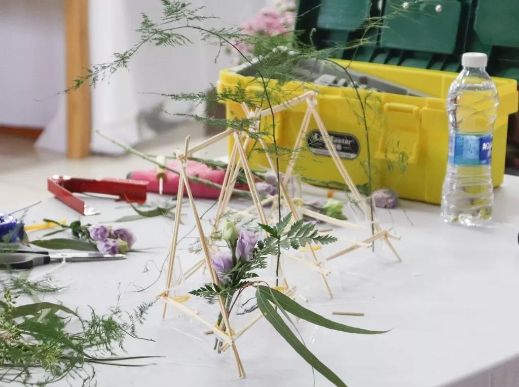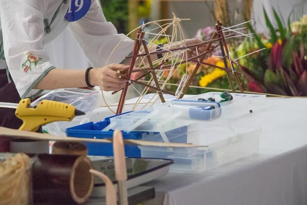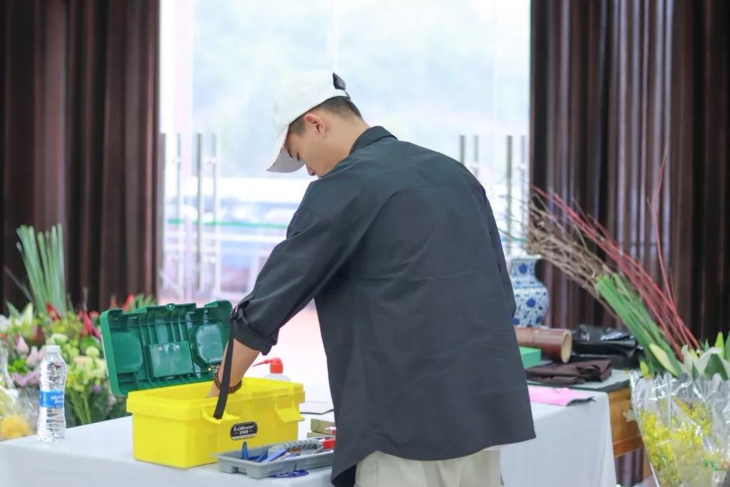 比赛现场操作有序,构思、选材、插花、修剪、装饰……选手们通过灵巧的双手和别致的构思,将散乱的花材、叶材和装饰品制作成了一件件赏心悦目的花艺作品。