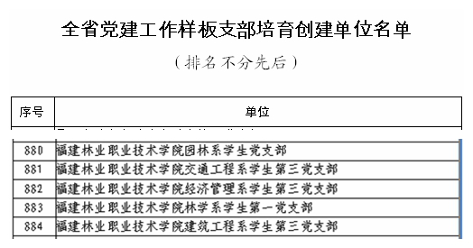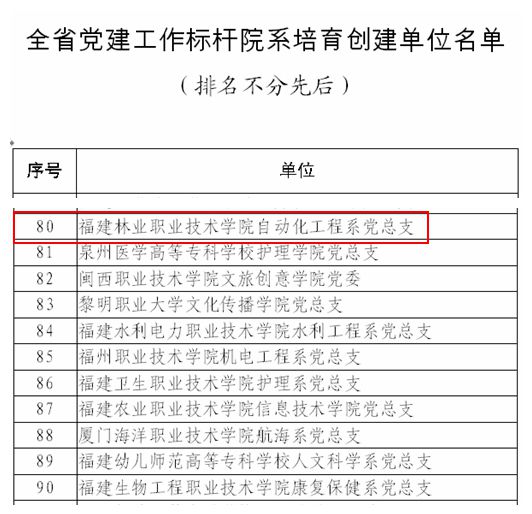 本网讯 近日,省委教育工委公布首批全省党建工作标杆院系、样板支部和“双带头人”教师党支部书记工作室培育创建单位名单。我院自动化工程系党总支入选全省党建工作标杆院系培育创建单位名单;园林系学生党支部、交通工程系学生第三党支部、经济管理系学生第三党支部、林学系学生第一党支部、建筑工程系学生第三党支部等5个党支部入选全省党建工作样板支部培育创建单位名单。
