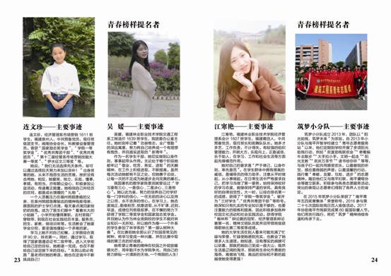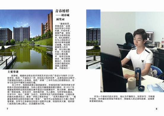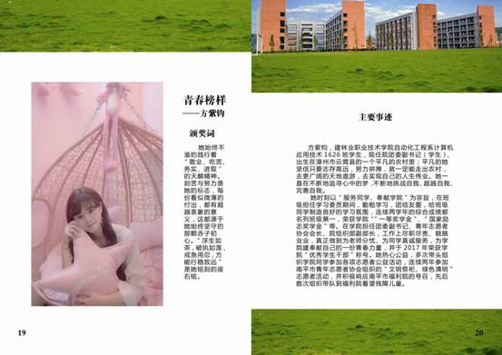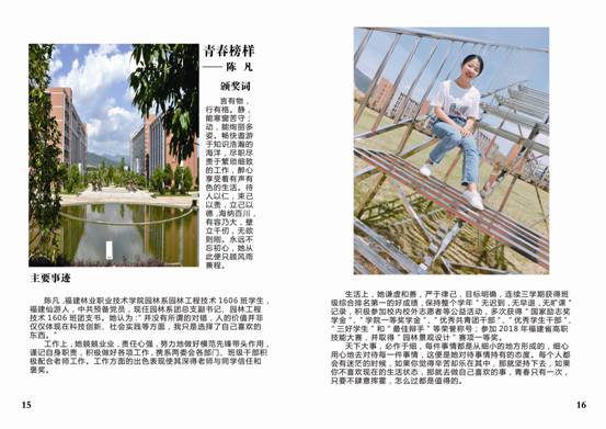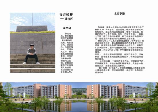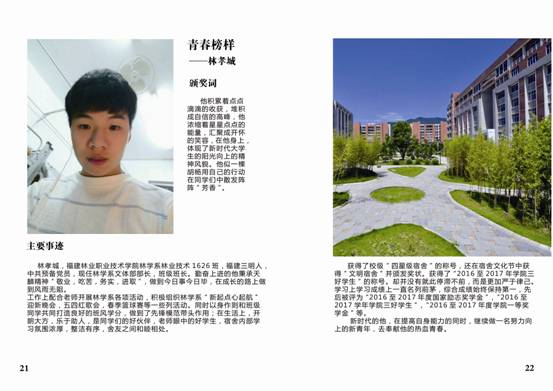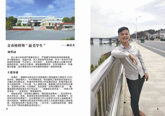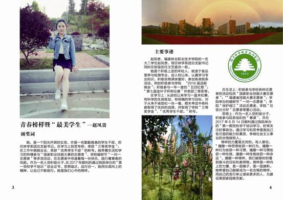 为深入贯彻落实党的十九大精神,围绕落实立德树人根本任务,积极培育和弘扬社会主义核心价值观,深入挖掘和宣传表彰大学生先进典型,充分发挥先进典型的示范引领作用,在全院营造促进大学生健康成长的良好环境,充分展现福建林业职业技术学院学子时代风采,努力以“勤学、修德、明辨、笃实”八字真经要求自己,积极引导广大团员青年向上向善。2018年3月,院团委在全院大学生中开展校园“青春榜样”暨“最美学生”人物评选活动,在全院范围内掀起了寻找身边“向上向善”青春榜样热潮,树立青年学生身边的榜样,发挥榜样模范作用,传递青春正能量,弘扬时代主旋律。通过校园“青春榜样”暨“最美学生”的评选,在广大学生中充分发掘刻苦钻研、勇于创新、开拓进取、奋发有为、自强不息的典型人物,充分展示我院学生风采,为实现学院创新、协调、绿色、开放、共享发展贡献青春与力量。