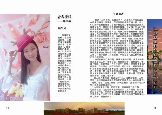 通过民主推荐,层层遴选,2位校园“青春榜样”暨“最美学生”、8位校园“青春榜样”、5位校园“青春榜样”提名者闪亮登场。他们自信乐观、奋斗不息,独吟“数风流人物,还看今朝”;他们志存高远、豪情万丈,合奏“千帆竞发,百舸争流”。他们用勤奋和汗水构成校园一道最绚丽的风景。校园“青春榜样”暨“最美学生”的评选,让团员青年们身边更多的“可亲、可敬、可信、可学”青年榜样典型走到同学们眼前,讲述他们的青春故事。校园“青春榜样”暨“最美学生”的评选旨在树立典型,引领在校大学生见贤思齐、崇德向善,牢固树立正确的文化观念和价值取向,引导其在向榜样学习的过程中坚定崇高信仰、珍惜青春时光、构筑阳光心态,努力按照习近平总书记对青年提出的“勤学、修德、明辨、笃实”八字真经精神严格要求自己,以饱满的热情投入到实现自己人生价值、投入到实现祖国伟大复兴的洪流中去。