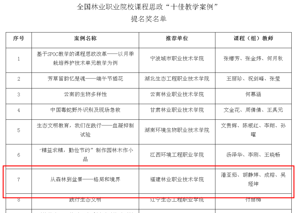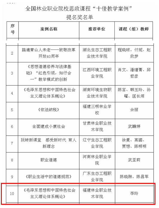 据悉,学院根据国家林业和草原局职业教育研究中心、中国林业教育学会职业教育分会《关于开展思政课程和课程思政“十佳教学案例”推选活动的通知》(林职教〔2019〕3号)要求,高度重视此次思政课程和课程思政“十佳教学案例”推选活动,经系部遴选推荐、学院评选,共选送了四个案例。经组委会审核、专家评选、主管部门审定等程序,共评选出全国林业职业院校思政课程“十佳教学案例”10个、课程思政“十佳教学案例”10个。同时,结合本次活动推选案例量多质优的实际,经专家评议,报经主管部门批准,分别评出思政课程“十佳教学案例”提名奖15个、课程思政“十佳教学案例”提名奖10个。