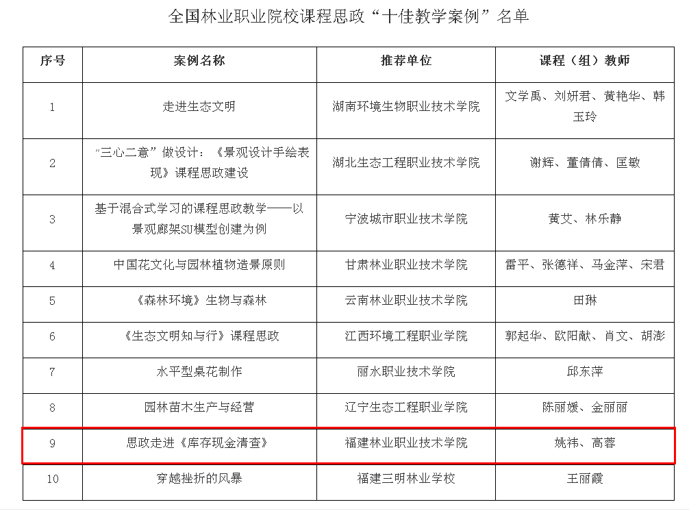 本网讯 近日,国家林业和草原局职业教育研究中心、中国林业教育学会职业教育分会公布全国林业职业院校思政课程和课程思政“十佳教学案例”获奖名单,我院姚祎、高蓉的《思政走进<库存现金清查>》案例获评课程思政“十佳案例”,李玲的《毛泽东思想和中国特色社会主义理论体系概论》和潘亚茹、胡静婷、成榕、吴娅坤的《从森林到盆景——格局和境界》分别获得思政课程和课程思政十佳提名奖。