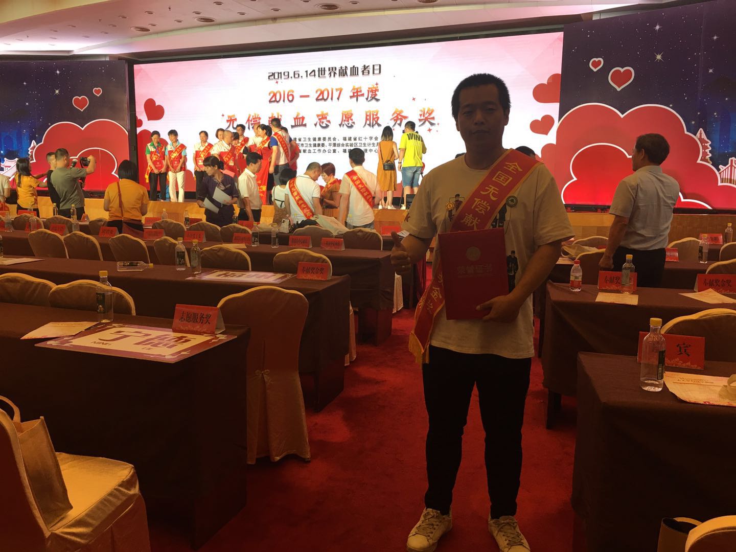 本网讯 近日,福建林职院青年教工陈亮同志荣获由国家卫计委、中国红十字总会、中国人民解放军后勤保障部卫生局联合颁发的“2016-2017年度全国无偿献血奉献奖金奖”,该奖是对累计献血8000毫升以上的人士颁发的国家级贡献奖。6月12日,陈亮同志受邀出席位于福建会堂六层国际厅召开主题为“人人享有安全血液”的“世界献血者日”庆祝活动暨全省无偿献血颁奖仪式。