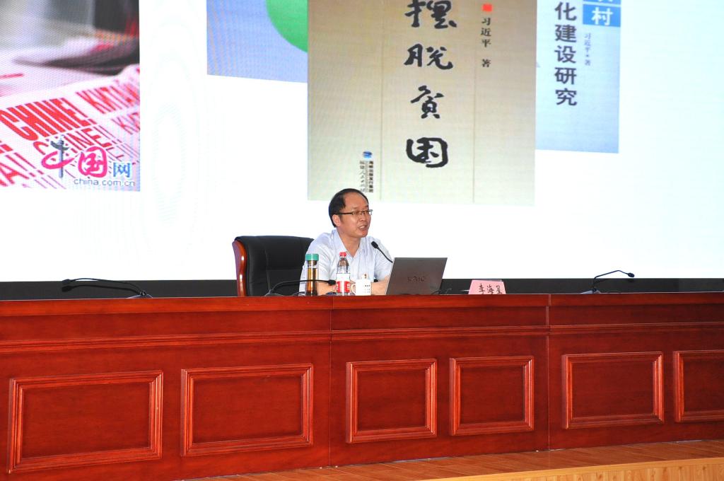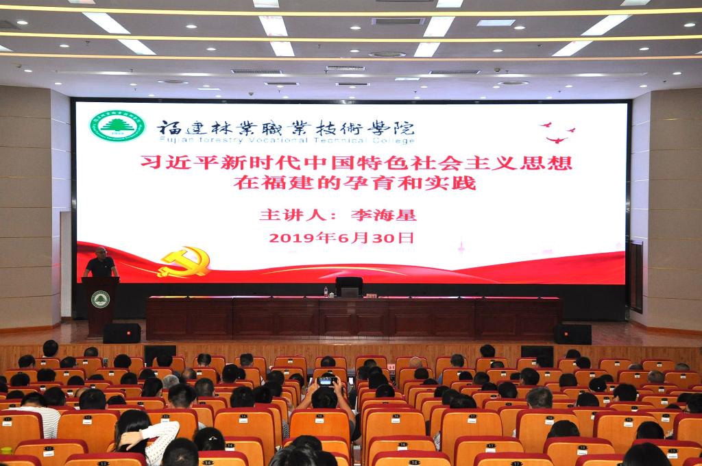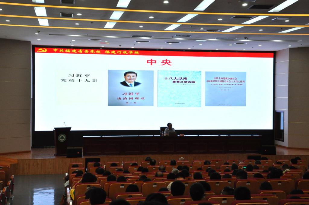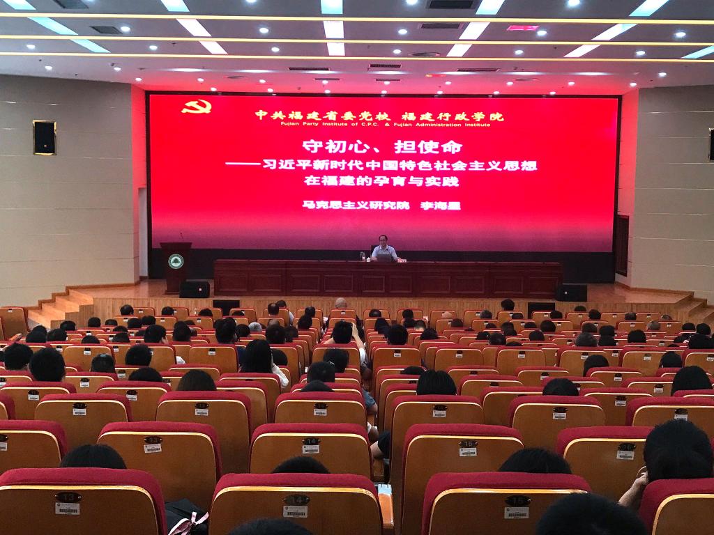 讲堂上,李海星教授结合自己多年的学习、调研、工作心得,简要介绍了博大精深的习近平新时代中国特色社会主义思想的基本内容,即思想内涵“八个明确”和基本方略“十四个坚持”,其内容丰富,涵盖经济发展、民主政治、文化建设、社会建设、生态文明、强军兴军、大国外交、党的建设等各个方面。李海星教授指出,“时代是思想之母,实践是理论之源”,习近平新时代中国特色社会主义思想是党和人民的伟大实践的结晶,与习近平总书记丰富的工作实践紧密相连。随后,李海星教授通过对福建在习近平新时代中国特色社会主义思想形成过程中有着尤其重要的作用的论证以及习近平新时代中国特色社会主义思想各个方面的系统、全面的阐述,从造福八闽,到为国担当;从保护历史文化遗产,到坚定文化自信;从“四下基层”,到全面从严治党;从建设服务型政府,到国家治理现代化;从清新福建,到美丽中国;从加强闽台合作,到推进祖国统一;从关心国防和军队建设,到强军兴军;从深化理论研究,到淬炼思想方法八个方面饱含深情地向在场师生介绍了习近平新时代中国特色社会主义思想在福建的孕育和实践过程。他表示,“政治上的坚定、党性上的坚定都离不开理论上的坚定。真学真懂真信才能真坚定,发自内心的认同才能支撑矢志不渝的信仰,才能‘不忘初心、牢记使命’,奋力走好新时代的长征路!”李海星教授用通俗易懂的语言,丰富详实的案例,深入浅出地引导在座师生党员要学习、学习再学习,用理论武装头脑,积极践行习近平新时代中国特色社会主义思想,给大家上了极其重要的一课!