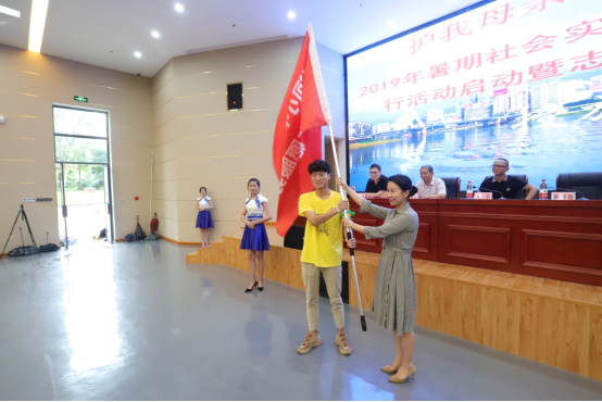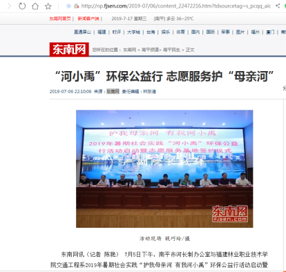 仪式上,我院严绍裕副院长及南平市环保志愿者协会林烈明会长先后致辞;南平市河长制办公室专职副主任黄春与我院交通工程系党总支李肇锋书记举行了《志愿基地共建协议》签约仪式;共青团南平市委张田怡副书记为“护我母亲河, 有我河小禹”青年环保志愿服务队授旗;在学生代表张敏同学表态发言后,严绍裕副院长宣布:“2019年暑期社会实践“护我母亲河, 有我河小禹”环保公益行活动正式启动”!