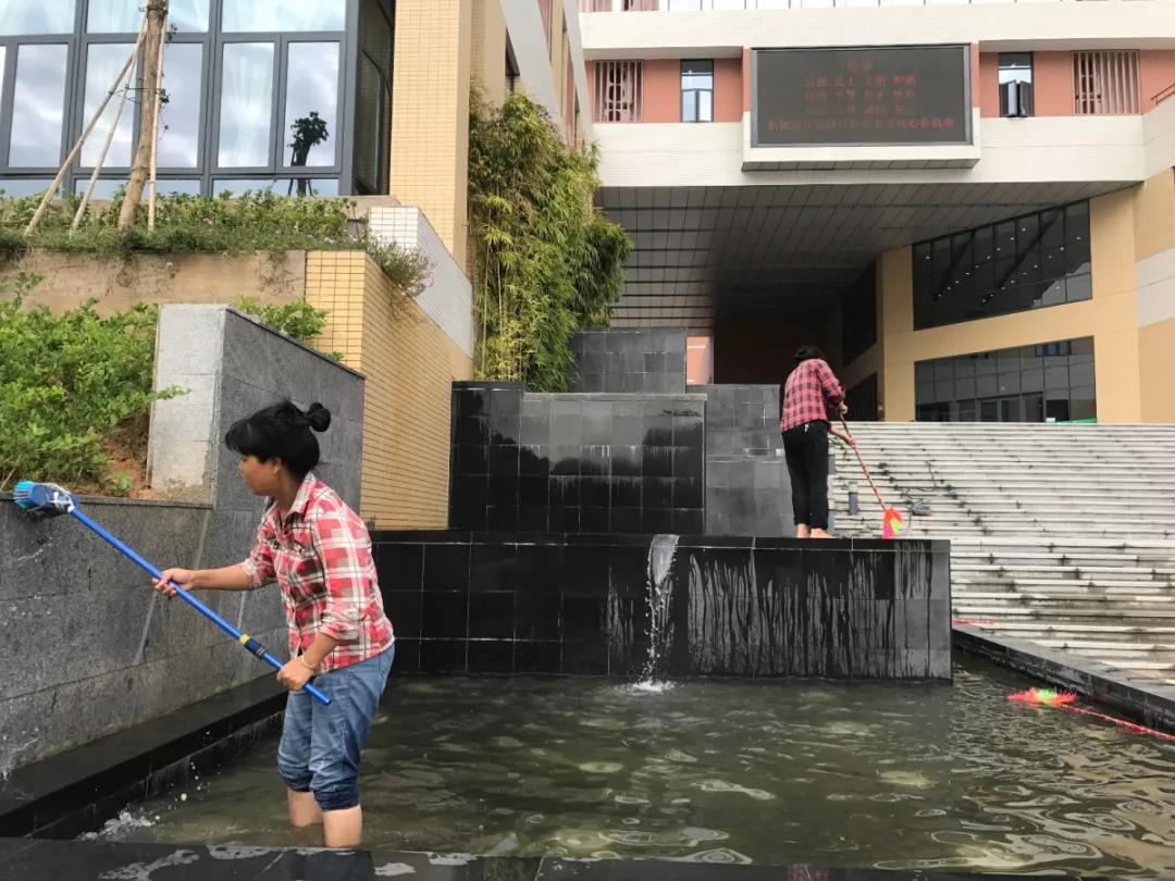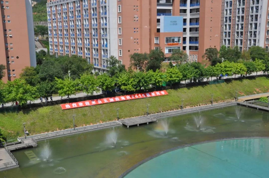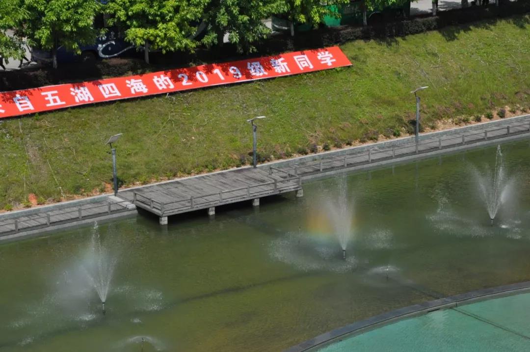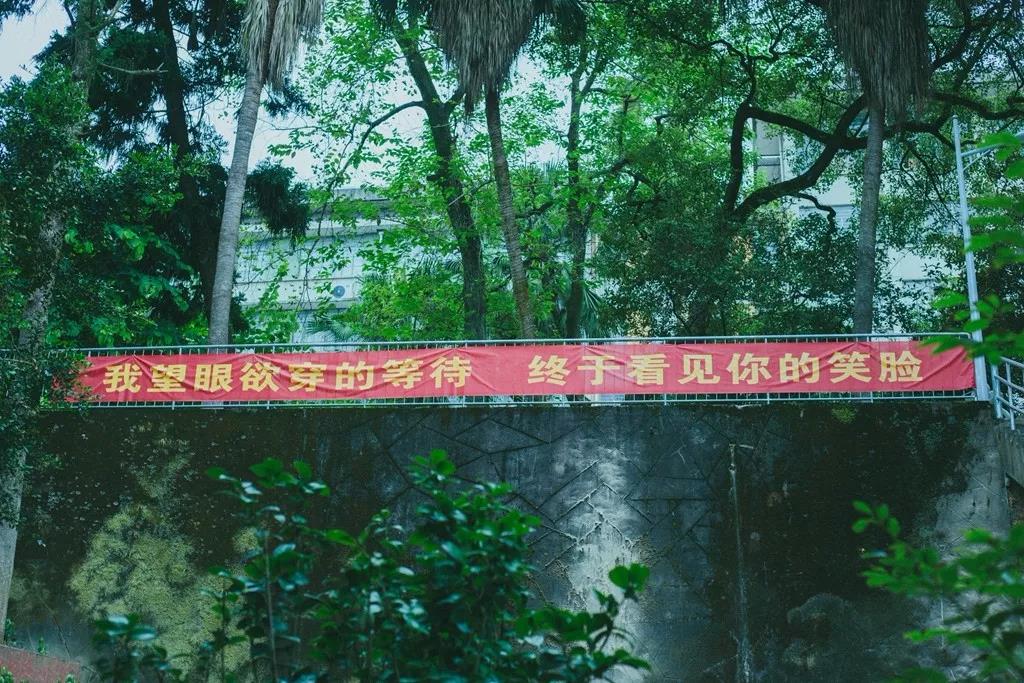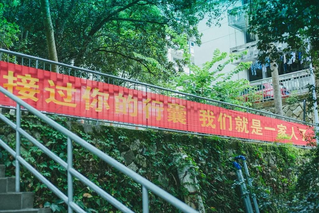 热情洋溢的迎新标语与绿树成荫的林职来了一场色彩的碰撞。