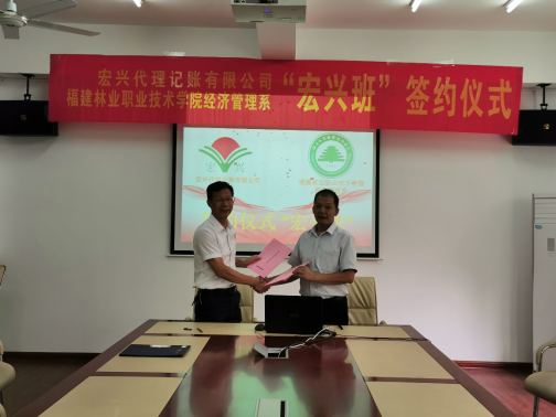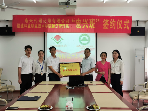 2019年,我院经济管理系与宏兴代理记账公司进一步深化校企合作,经过学生自愿报名、企业面试等程序,选出15名2019级准毕业生组成由宏兴代理记账公司冠名的“宏兴班”,在10月开始到企业当中采取企业现场教学。刘院长代表学院同宏兴会计集团创始人庄惠忠先生、“宏兴班”学生代表共同举行了“宏兴班”签约仪式,签订了学院、企业和实习生三方实习协议书,并授予宏兴集团“福建林业职业技术学院校企合作基地”牌匾。“宏兴班”是学院的一次教育改革尝试,以期能够更好地对接社会人才需求,提高人才培养质量,同时,我院经济管理系也将以此次订单式培养为契机,认真总结经验,适时调整,探索出一种学生、学校和企业多方受益的人才培养模式,更好的为教育教学服务。