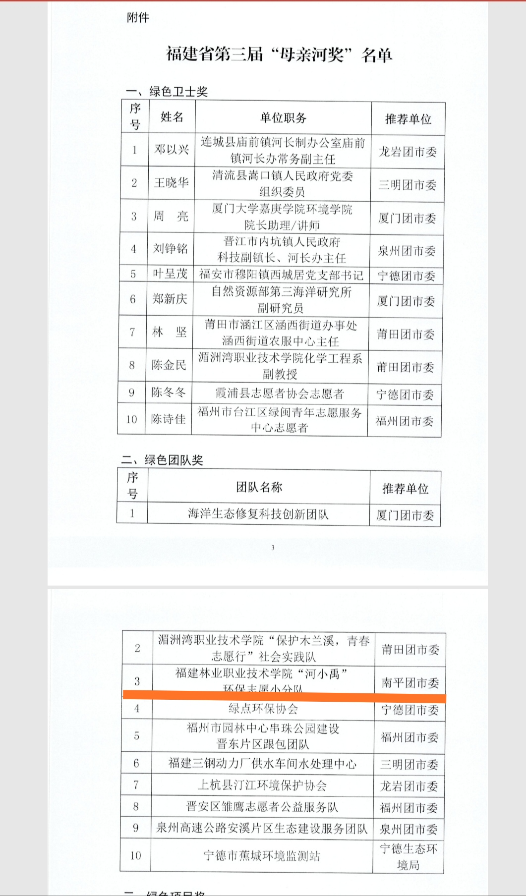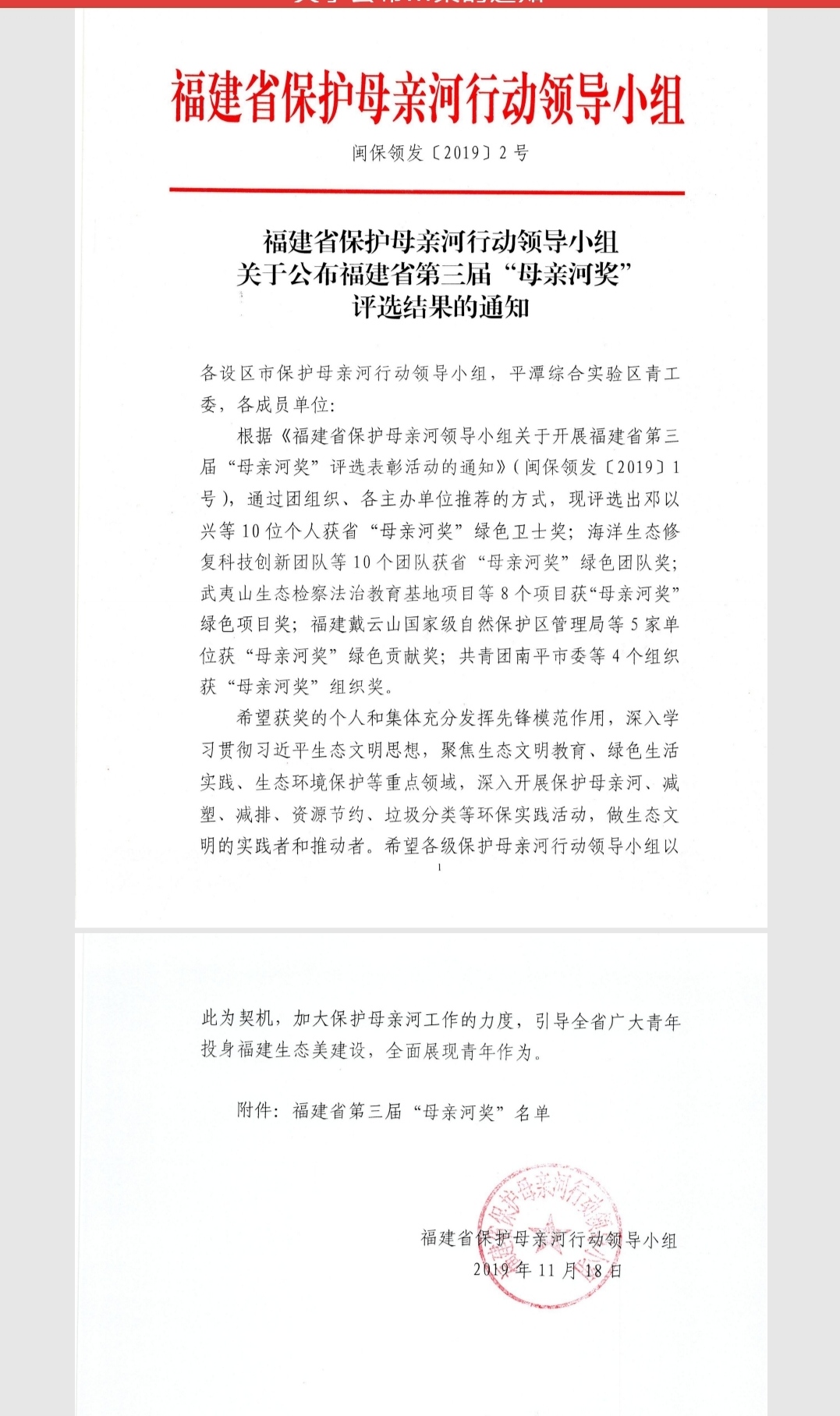 本网讯 2019年11月18日,福建省保护母亲河行动领导小组公布福建省第三届“母亲河奖”评选结果,我院交通工程系“河小禹”环保志愿小分队获得绿色团队奖。
