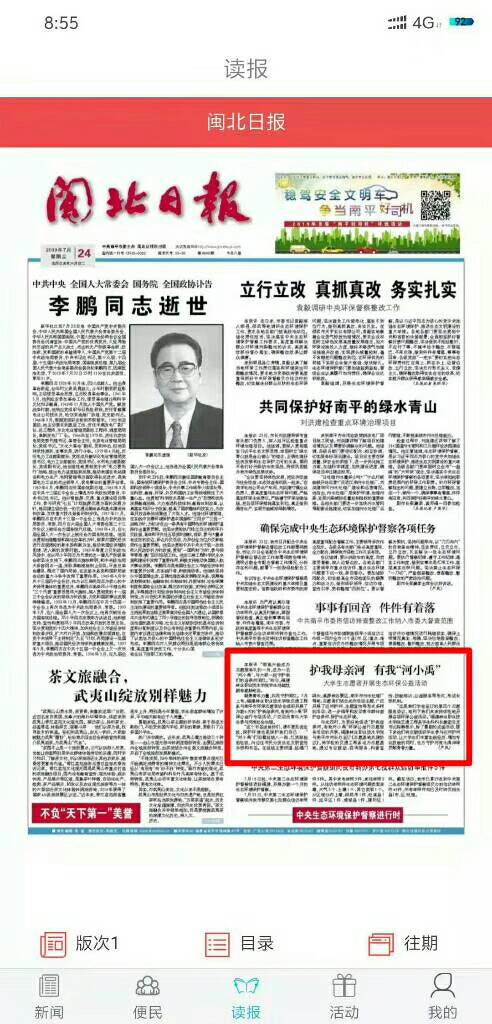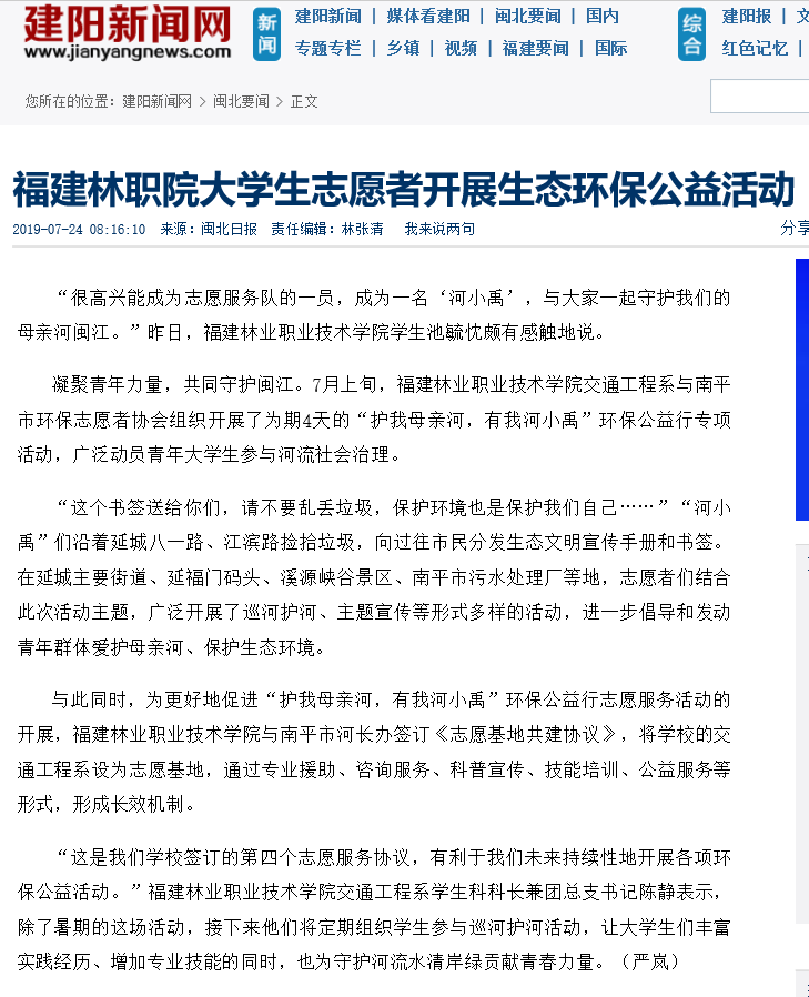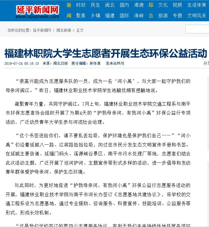 据悉,福建团省委为每支“河小禹”专项活动实践队划拨专项经费,要求各高校将之列为校级重点实践队,同时于校级层面给予其资金保障;共青团南平市委副书记张田怡为我院“河小禹”志愿服务队授旗;我院与南平市河长制办公室签订《志愿基地共建协议》,并联合南平市环保志愿者协会共同协作,以形成长效机制;另外,学院鼓励建立课题开展持续性调研,一次性解决实践队经费问题,极大地调动了队伍参与实践的积极性。