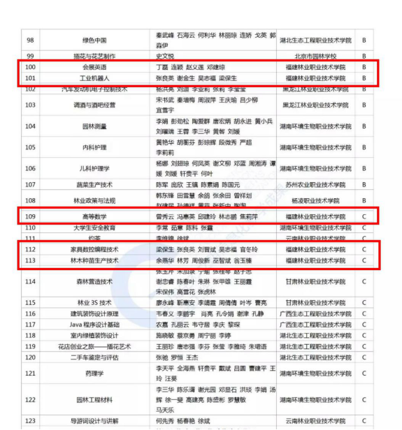 本网讯 日前,国家林业和草原局院校教材建设办公室、中国林业教育学会公布了“2019年全国生态文明信息化教学成果遴选工作”遴选结果。我院《会展英语》《工业机器人》等2门课程被确定为职业教育组B等级,《高等数学》《家具数控编程技术》《林木种苗生产技术》等3门课程被确定为职业教育组C等级,《林业统计》等18门课程入围。