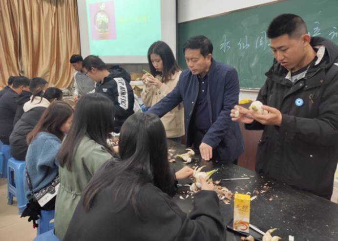 活动开始前,黄梓良副教授为全体参赛选手介绍了水仙花的相关知识和雕刻方法。中国水仙分为单瓣型和复瓣型两种,其中单瓣型又被称为“金盏玉台”、“酒杯水仙”,复瓣型有“百叶水仙”、“玉玲珑”的叫法。水仙雕刻造型主要是对花、叶的雕刻,使花、叶达到艺术造型的目的——一番专业讲解,为“比赛”增添了诗意的色彩。