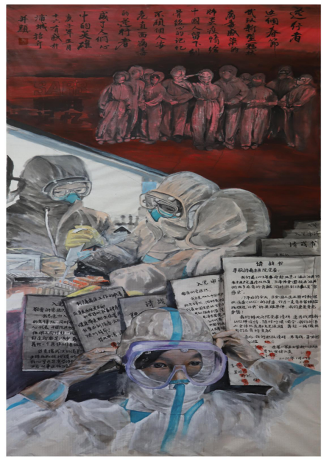 建筑工程技术1902(军)班章拾斤同学创作抗击新冠肺炎主题绘画《逆行者》