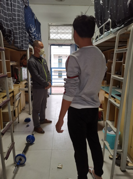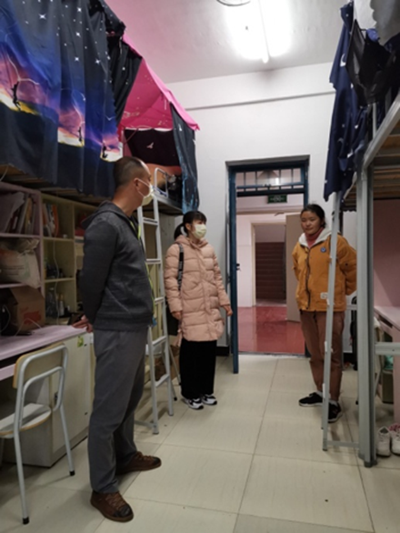 陈剑勇书记与学生面对面交流,查看了他们的住宿情况,关切询问了他们在疫情防控期间的学习和生活情况,向他们介绍了当前疫情防控形势以及学院的防护措施,叮嘱他们要提高防范意识,积极配合学校做好疫情防控工作,严格按照学院疫情防控相关要求科学应对,注意保持宿舍卫生,适度进行体育锻炼,保持规律的饮食作息,提高身体免疫力,每天做好开窗通风、体温测量等工作,做好自我防护,不恐慌,不外出,不聚集,生活中碰到问题及时与辅导员老师联系沟通。同时,他希望同学们要合理利用假期留校时间认真学习,为即将开展的线上教学做好准备工作,做到“停课不停学”。留校学生表示,来自系部领导老师的关心使他们倍感温暖,在校期间将服从学校各项规定,自觉做好自身防护。