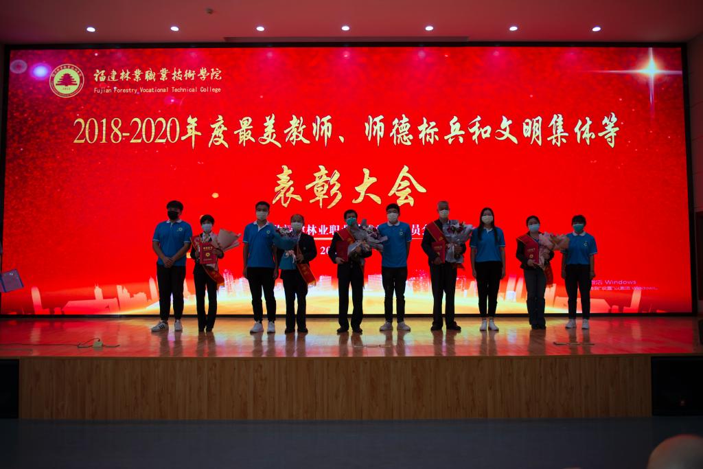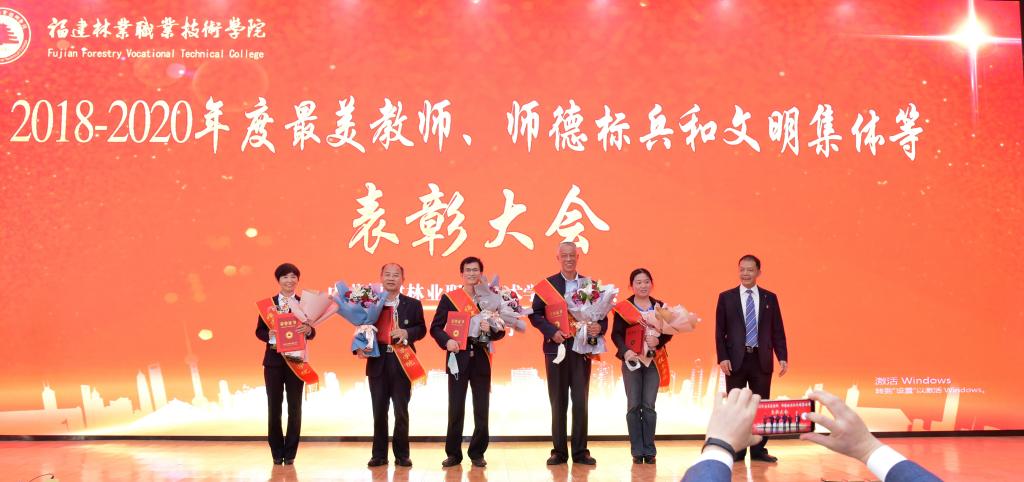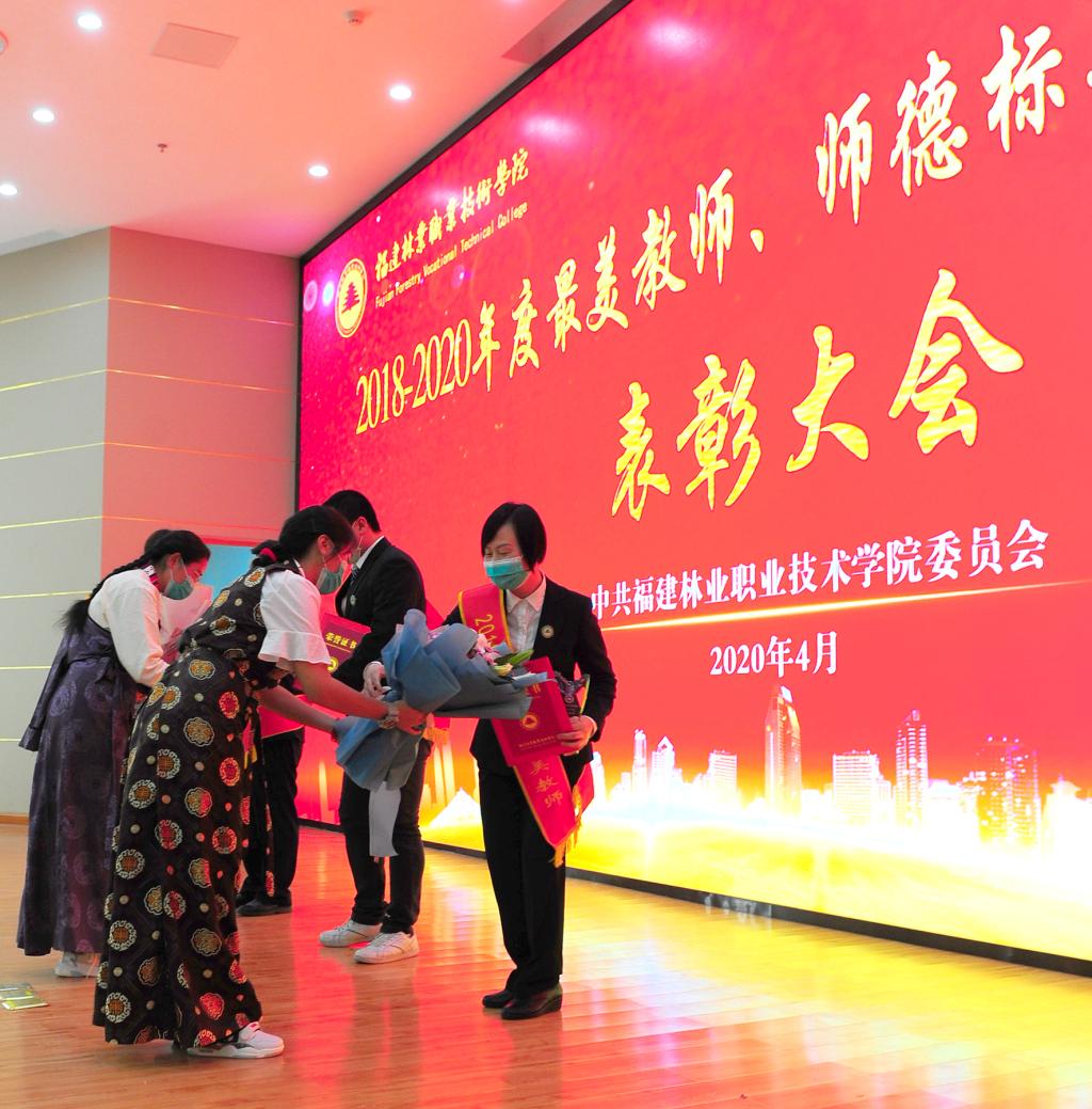 学院2018-2020年度“最美教师”和“师德标兵”表彰是本次表彰大会的重头戏。陈亮、华建祥、黄云玲(排名不分先后)等3位福建林业职业技术学院2018-2020年度“最美教师”及高蓉、黄华明、陈友益、洪福兴、连颖(排名不分先后)等5位福建林业职业技术学院2018-2020年度“师德标兵”受到隆重表彰。“他,虽然不是正式的在编教师,却充满爱心和恒心。”自2004年起,陈亮老师坚持献血16年,共献血47次,合计18220毫升,其中全血2800毫升,血小板75.1个治疗量;华建祥老师用最专业的代码语言为学生解疑答惑,以平台服务师生,用知识浇灌课堂,以技能成就学生;黄云玲老师30多年甘守三尺讲台,课堂教学扎实,热爱关心学生,勤勤恳恳、踏踏实实,她用这种平凡赢得了学生的尊重……一段段VCR,一个个模范人物的感人事迹,主持人一句句饱含深情的颁奖词让现场每一位师生深受感动。