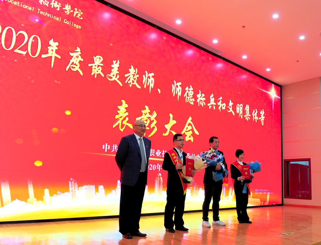 随后,进行文明集体、防疫先进个人及2019年优秀教师、优秀教育工作者和优秀辅导员表彰。院长刘文开宣读了《关于表彰2018-2020年度文明处室、文明系部、文明教研室、文明食堂的决定》,公布了人事处、招生就业办公室(排名不分先后)荣获“文明处室”称号;自动化工程系荣获“文明系部”称号;林业教研室、建筑工程教研室(排名不分先后)荣获“文明教研室”称号;江南校区第二食堂荣获“文明食堂”称号,并向受到表彰的文明集体颁发奖牌。