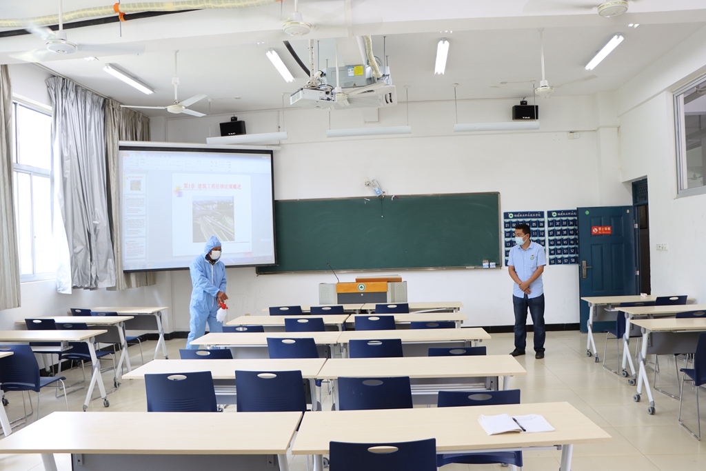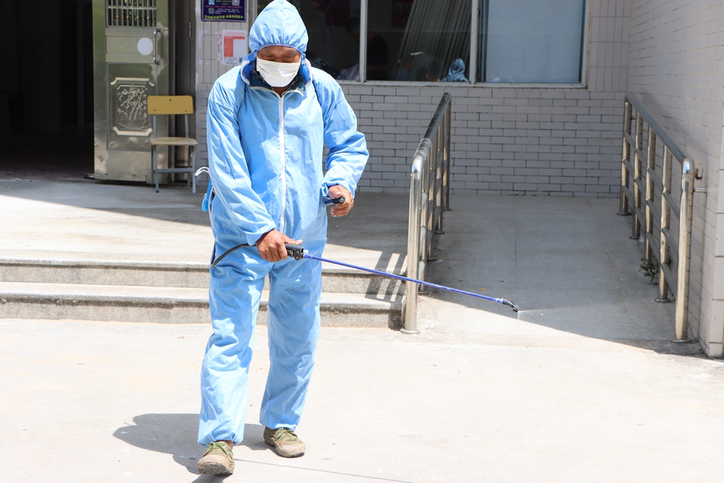 ▲消杀人员对体温异常学生途经地进行消杀