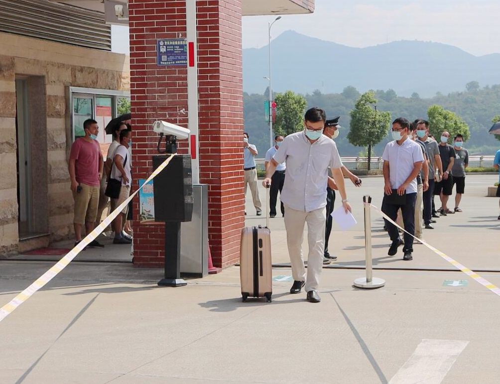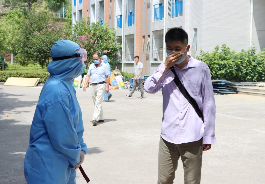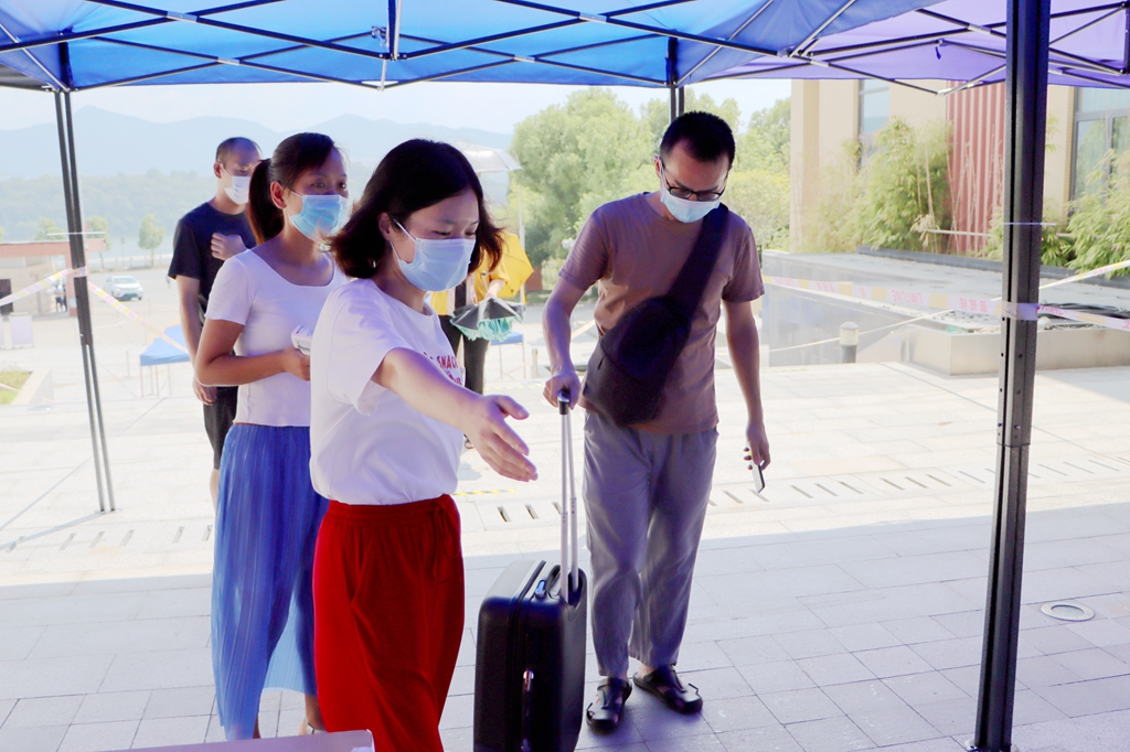 ▲学生有序排队,测温进入宿舍