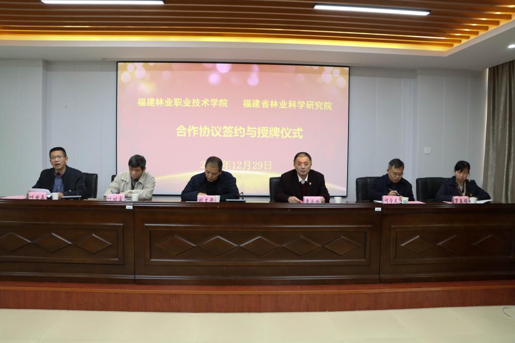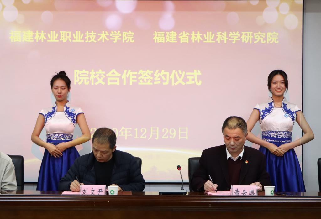 本网讯 为构建“政校行企”多元育人平台 ,创新人才培养模式,促进院校双方各展所长、协同创新,全面提升科技创新和服务经济社会发展的能力,促进林业科技合作与交流,12月29日下午,福建林业职业技术学院与福建省林业科学研究院合作协议签约与授牌仪式在我院江南校区举行。我院党委副书记、院长刘文开教授,福建省林业科学研究院院长黄云鹏教授级高工出席仪式并分别代表双方签署协议。