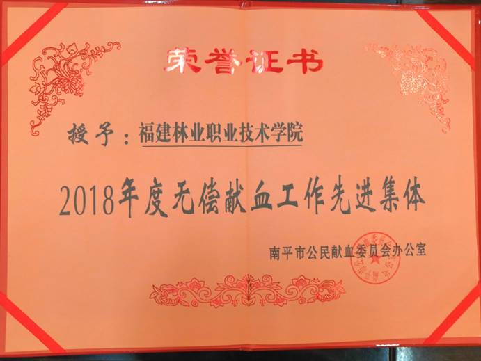 本网讯 日前,福建林业职业技术学院荣获2018-2019年度全国无偿献血促进奖,由国家卫生健康委员会与中国红十字会总会、中央军委后勤保障部卫生局联合表彰,已在国家卫生健康委员会网站公示。全国共表彰2018-2019年度无偿献血促进奖单位449个,其中福建省12个,福建林业职业技术学院位列其中。
