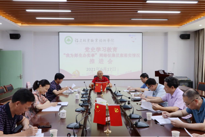 本网讯 6月17日,学院在江南校区办公楼第一会议室召开党史学习教育“我为师生办实事”网络征集议案落实情况推进会。院党委书记万泉,院党委副书记严绍裕出席会议,党政办公室、宣传部、教务处、学生工作部、后勤管理处、计划财务处、院团委、招生就业办公室、安全保卫部等相关部门负责人参加会议。会议由严绍裕副书记主持。