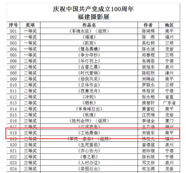 本网讯 为迎接和庆祝中国共产党建党100周年,深入贯彻十九届五中全会精神,回顾“十三五”,奋进“十四五”,讴歌中华民族实现伟大复兴的奋斗历程,颂扬中国共产党的丰功伟绩,交通工程系教工党支部党员宋晓东同志深入生活,积极创作,运用影像艺术热情讴歌福建经济社会发展的显著成就,2021年6月21日,作品《工地晨曲》荣获庆祝中国共产党建党100周年福建摄影大赛三等奖。