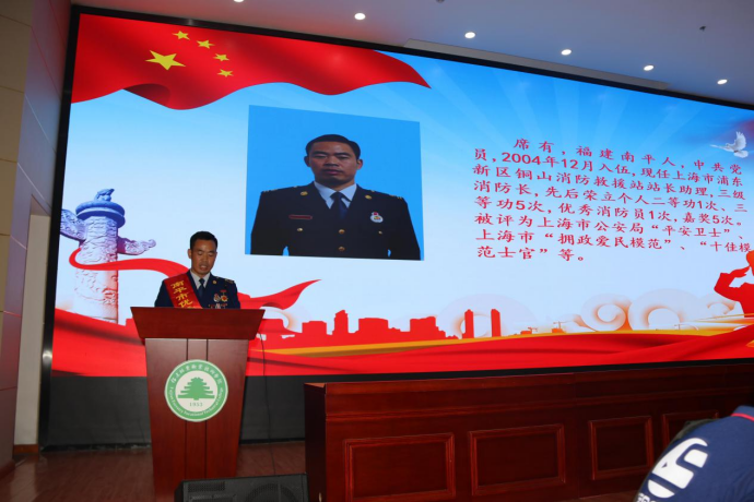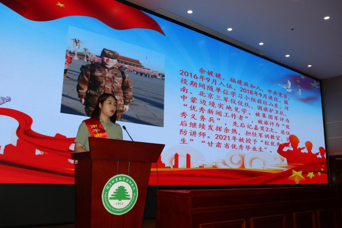 南平军分区动员处叶章文参谋向参会人员隆重介绍优秀大学生退役士兵报告团成员林璨、余媛媛、席有。他表示征召大学生入伍,做好大学生应征入伍工作,为部队选送高素质人才,是学校义不容辞的光荣职责,希望广大青年学子积极响应党和国家号召,肩负起新时代、新形势青年的责任,踊跃参军入伍,到部队这个大熔炉里去锻炼成长,建功立业,为军队和国防现代化建设作出大学生应有的贡献。