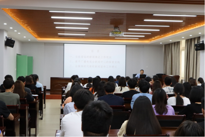 邱太文记者从当前面临的新闻舆论工作现状、南平广播电视台新闻中心的探索实践、全媒体时代高校新闻宣传工作建议等三个方面展开阐述。在“当前面临的新闻舆论工作现状”部分,邱记者重点阐述了“四全媒体”的概念,即:全程媒体、全息媒体、全员媒体、全效媒体,指出新闻舆论工作面临新的挑战;在“南平广播电视台新闻中心的探索实践”部分,介绍了南平广播电视台新闻中心的创新实践,包括“一次采集、多种生成、多元传播”、平移品牌:“刚刚帖”与“深度解读”、实施“头条工程” 壮大主流思想舆论、成立工作室,推进节目创新创优等;在“全媒体时代高校新闻宣传工作建议”部分,结合我院实际情况,从“新闻和宣传”、“移动优先”、“开门办报”、“策划先行”等四个方面给出针对性建议。