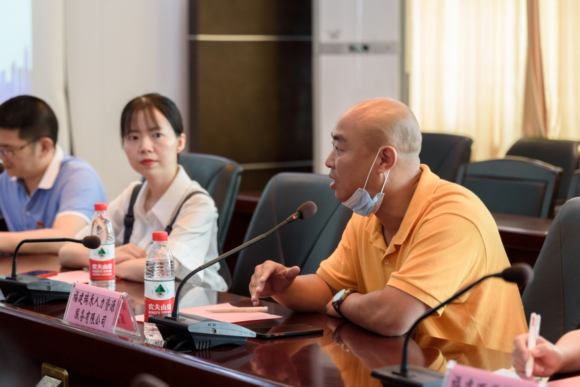 本网讯 为了解企业对高素质技术技能人才的需求,助推校企深度合作,积极响应教育部关于“鼓励职业院校的书记、校长带头联系100家以上的企业(含企业到校走访)”号召,2021年6月26日,福建林业职业技术学院党委书记万泉、院长刘文开分别与来校参加校园招聘会的福建麦田房产经纪有限公司、福建瑞禾人力资源服务有限公司等企业代表进行了座谈交流。座谈会分别由艺术传媒系党总支书记陈政及经济管理系副主任(主持工作)林文胜主持。