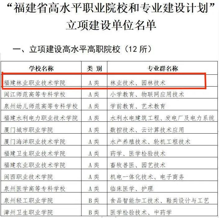 据悉,根据《福建省教育厅 财政厅关于印发福建省高水平职业院校和专业建设计划实施方案的通知》(闽教职成〔2020〕29号)精神,在学校申报、学校主管部门核查推荐的基础上,经专家评审和公示程序,确定“福建省高水平职业院校和专业建设计划”(以下简称省级“双高计划”)立项建设单位名单。其中,立项建设高水平高职院校12所,国家“双高计划”建设单位立项建设专业群10个,其他院校立项建设专业群24个,立项建设高水平中职学校36所,立项建设高水平中职专业群108个。