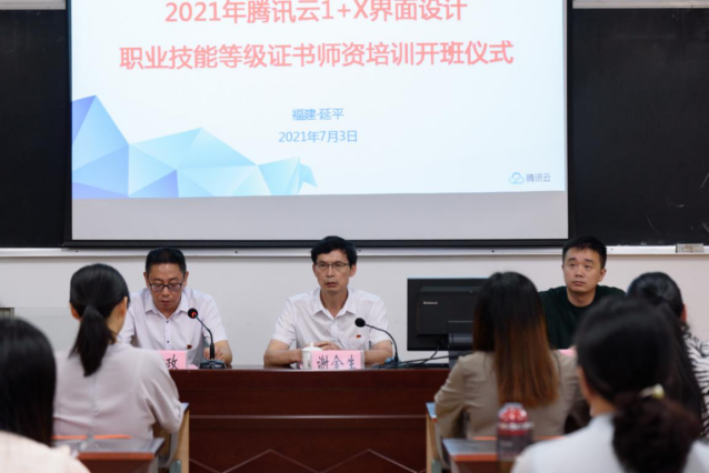 本网讯 清新福建,魅力八闽;七月盛夏,相聚延城。为深入贯彻《国家职业教育改革实施方案》精神,落实教育部《关于在院校实施“学历证书+若干职业技能等级证书”制度试点方案》、《关于组织开展“1+X"证书制度试点院校教师培训的通知》要求,推动“1+X”证书制度试点工作的顺利开展和落实,提升试点院校教师实施教学、培训和评价的能力,2021年7月3日上午,腾讯云“1+X”界面设计职业技能等级证书师资培训班在福建林业职业技术学院天麟校区顺利开班。