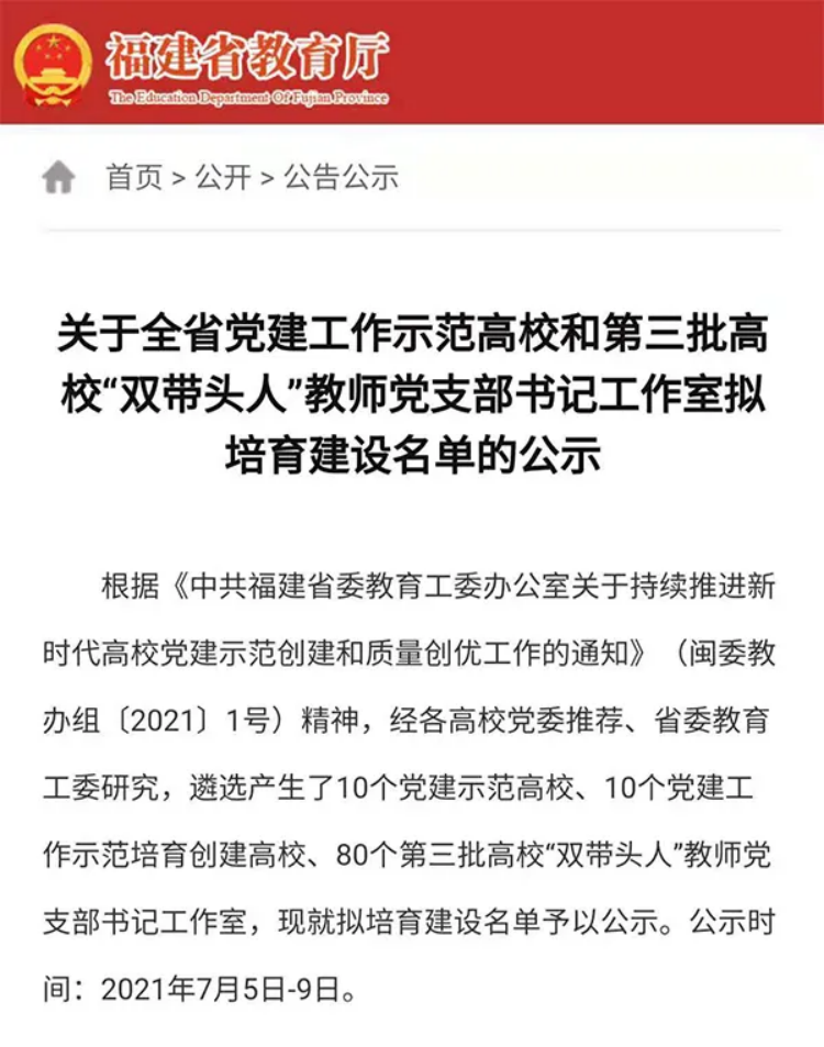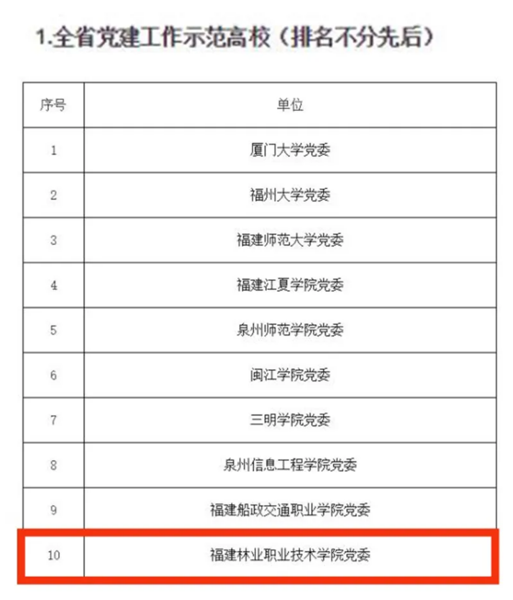 本网讯 7月5日,省委教育工委公示了全省党建工作示范高校和第三批高校“双带头人”教师党支部书记工作室拟培育建设名单,我院入选全省党建工作示范高校!林学系教工党支部书记工作室入选全省第三批高校“双带头人”教师党支部书记工作室!现已进入公示阶段。这是继我院被确定为首批福建省高校党建工作示范点、信息工程系党总支被确定为“全国党建工作标杆院系”后党建工作取得的新成效。