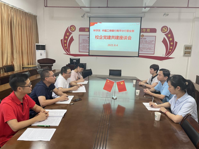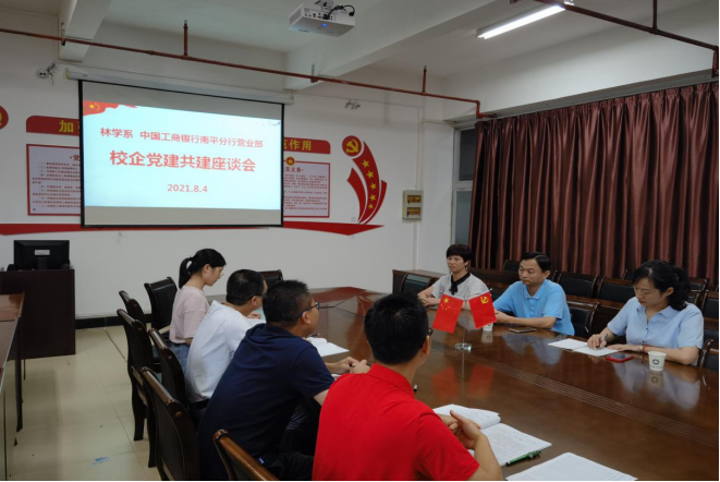 本网讯 为庆祝中国共产党成立100周年,构建校企“资源共享、优势互补、互相促进、共同提高”的党建工作新格局,2021年8月4日,我院林学系党总支与中国工商银行南平分行营业部党支部开展党建共建活动。校企党建共建启动会在林学系党建室举行。林学系党总支书记徐洪、主任廖建国、组织员罗勇、学生第二党支部书记樊寿娜,中国工商银行南平分行营业部行长邱安生、副行长李菊梅、营业部主任郑之昳参加本次启动会。会议由徐洪书记主持。