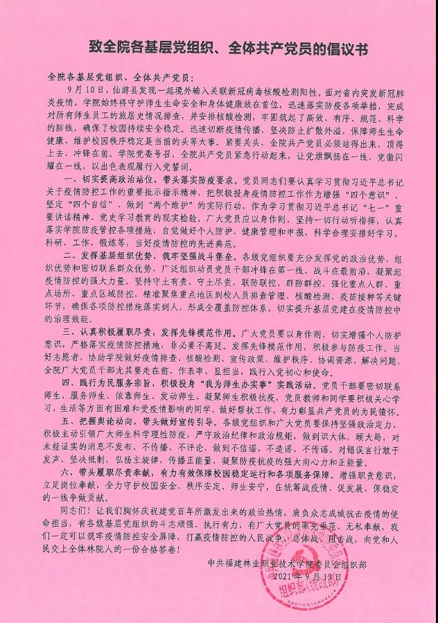 本网讯 近期,我省多地相继出现新冠肺炎疫情,福建林业职业技术学院党委高度重视,将守护全院师生生命安全放在首位,严格贯彻落实福建省教育工委、省教育厅以及延平区疾控中心防控工作的决策部署,积极发挥各级党组织的政治优势、组织优势、密切联系群众优势,充分发挥党员战斗堡垒作用和先锋模范作用,从快从严从紧从实落实各项防控措施。