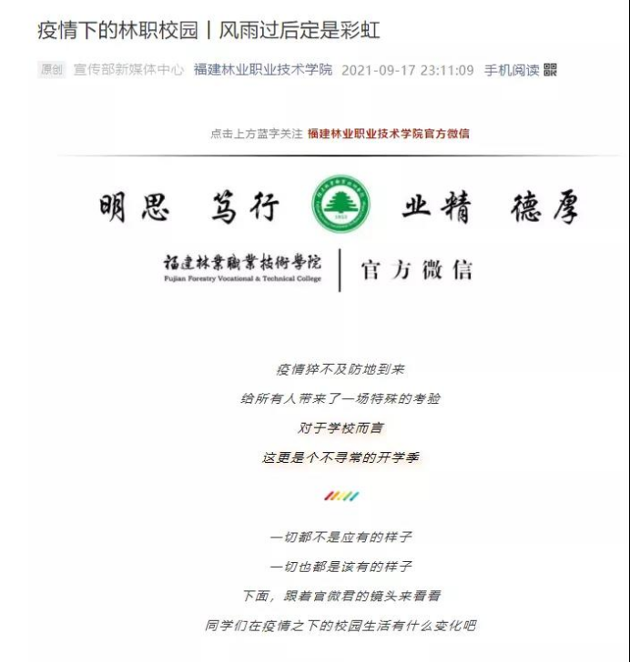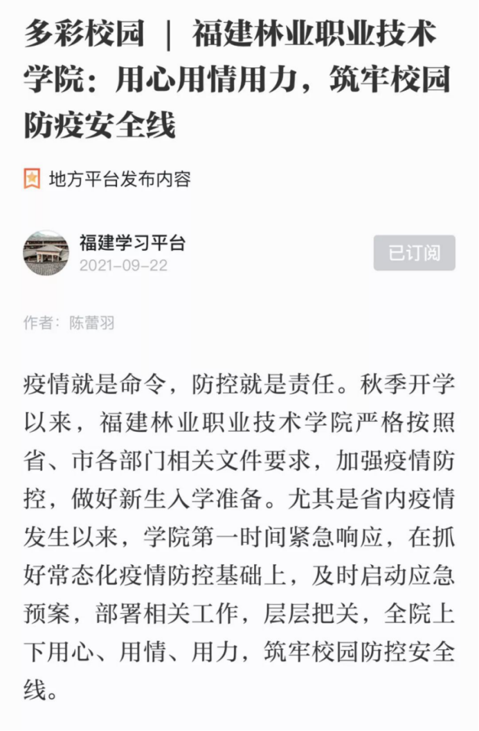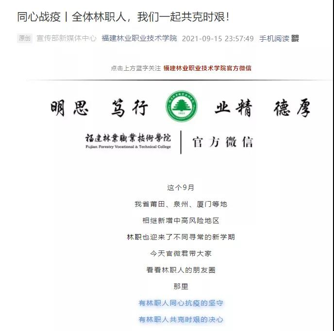 9月10日以来,仙游县、泉港区、厦门等多地发现新冠病毒确诊人员,福建林业职业技术学院党委第一时间激活联防联控机制,先后召开疫情防控部署会议4场;第一时间完成对中高风险师生信息排查,排查出已返校师生中有莆田旅居史的634人,其中仙游县旅居史319人;第一时间全院26701人次核酸检测;第一时间安排101名师生前往隔离点隔离;第一时间将全院297门课程转入线上教学;院党委组织部第一时间发布《致全院各基层党组织、全体共产党员的倡议书》,号召各基层党组织、党员肩负起抗击疫情的使命担当,筑牢疫情防控安全屏障。一项项防控措施快速精准到位,构成“从快”的完整链条。全院师生一条心,将疫情扑灭在初始阶段。