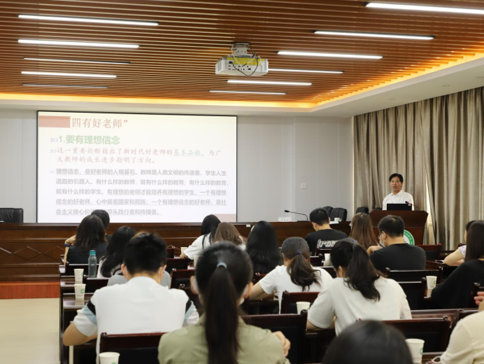 百年大计、教育为本,教育大计、教师为本,教师大计、师德为本。习近平总书记指出“一个人遇到好老师是人生的幸运,一个学校拥有好老师是学校的光荣,一个民族源源不断涌现出一批又一批好老师则是民族的希望。”“评价教师队伍素质的第一标准应该是师德师风。师德师风建设应该是每一所学校常抓不懈的工作。”10日上午,严绍裕副书记紧紧围绕高校师德师风建设,从四个方面深刻阐述了如何成为一名新时代好老师。一是对照新标准,做时代“四有”好老师。他详细讲解了新时代好老师新标准,提出新教师要带头锤炼师德师风,争做“有理想信念、有道德情操、有扎实知识、有仁爱之心”四有好老师;要在日常教学科研实践中,带头践行“教书和育人、言传和身教、潜心问道和关注社会、学术自由和学术规范”四个相统一;要在培育时代新人中积极作为,真正做到在“坚定理想信念、厚植爱国主义情怀、加强品德修养、增长知识见识、培养奋斗精神、增强综合素质”下功夫;要自觉发挥积极性、主动性、创造性,做到“政治要强、情怀要深、思维要新、视野要广、自律要严、人格要正”,做学生“学习知识、创新思维、奉献祖国”的引路人。二是对标先进典型,争当新时代师德标兵。着重介绍了“时代楷模”黄大年、2019年至2021年“全国教书育人楷模”张桂梅、钟南山、张伯礼等十位代表的先进事迹,要求广大教师以先进典型为榜样,立足本职岗位,立德修身,潜心治学,开拓创新,真正把为学、为事、为人统一起来,当好学生成长的引路人。三是加大警示教育,自觉锤炼师德师风。通报了 2021年5月11日教育部教育司公布的违反高校教师职业行为十项准则的11个典型案例,以案说纪、以案释法,要求教师以案为鉴、律己守正,自觉强化师德师风锤炼。四是落实行为准则,深化师德师风建设。认真解读《新时代高校教师职业行为十项准则》,帮助全体参训新教师全面理解和准确把握,要求每位新入职教师知准则、守底线,真正把教书育人和自我修养结合起来,时刻自重、自省、自警、自励,自觉做以德立身、以德立学、以德施教、以德育德的楷模,维护教师职业形象,提振师道尊严。