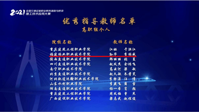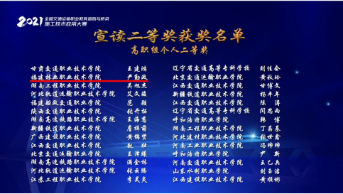 本网讯 11月27-28日,由全国交通运输职业教育教学指导委员会主办的2021年全国交通运输职业教育“道路与桥梁施工技术应用技能大赛”在西安落下帷幕。我院交通工程系王余鹏、韩伟、李林威、孙华等教师组织相关专业学生参加了本次比赛。经过设计实战赛、全国模拟选拔赛及全国总决赛的层层遴选,最终2支队伍进入了总决赛,并斩获高职组个人赛一等奖1个(姜伟鑫同学)、二等奖1个(严勤政同学)、三等奖1个(郑建煌同学);高职组团体赛三等奖;孙华、李林威老师获“优秀指导教师”称号。
