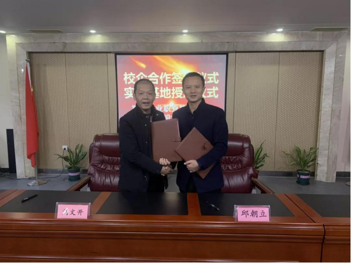 会议最后,刘文开院长与邱朝立总经理代表校企双方签订了合作协议,刘文开院长为福建新纪建设集团有限公司授予实训基地牌匾,并合影留念。