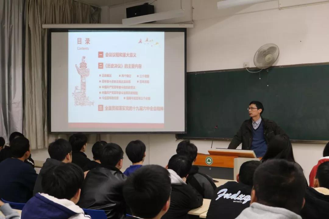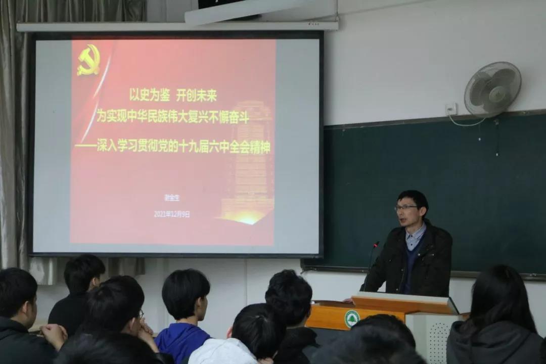 本网讯 为让学生准确把握和理解党的十九届六中全会精神,汲取精神力量,强化使命担当,学习好、宣传好、贯彻好全会精神,用全会精神统一思想、凝聚共识、坚定信心、增强斗志,确保把全会精神贯彻到自己的学习和生活当中,12月9日晚,学院副院长谢金生为所联系班级交通工程系城市轨道交通工程技术2001班开展“以史为鉴、开创未来,为实现中华民族伟大复兴不懈奋斗——深入学习贯彻党的十九届六中全会精神”专题党课。