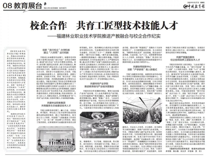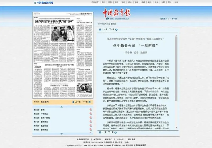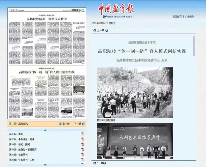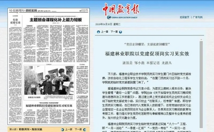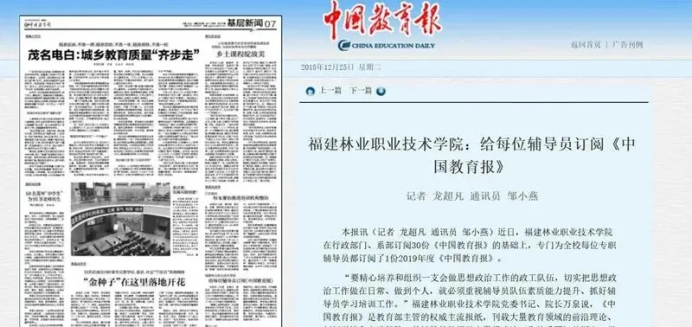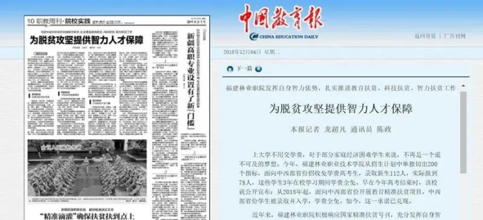近年来,学院党委高度重视教育新闻宣传工作,坚持以习近平新时代中国特色社会主义思想为指导,围绕立德树人根本任务,充分发挥主流媒体的宣传、引领作用,积极开展对外宣传。先后在《中国教育报》刊登了《福建林业职业技术学院高职院校“体—制—链”育人模式创新实践》《校企合作 共育工匠型技术技能人才——福建林业职业技术学院推进产教融合与校企合作纪实》《福建林业职业学院变“输血”型资助为“输血与造血结合”学生物业公司“一举两得”》《为脱贫攻坚提供智力人才保障——福建林业职院发挥自身智力优势,扎实推进教育扶贫、科技扶贫、智力扶贫工作》《“党员走到哪里,支部就建到哪里”——福建林业职业技术学院破难点创机制,着力构建顶岗实习管理新模式》等文章,向全国推广学院在落实高校立德树人根本任务、推进职业教育现代化等方面的典型做法,扩大学院办学影响,提升学院社会声誉。