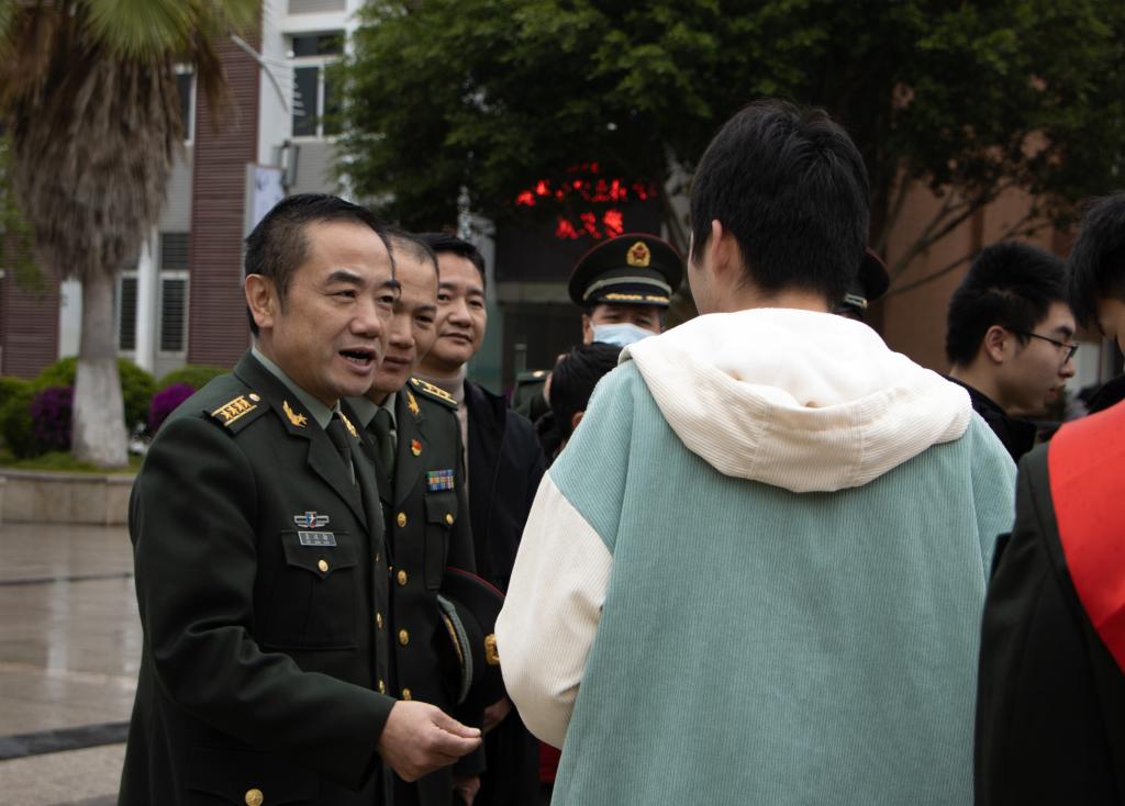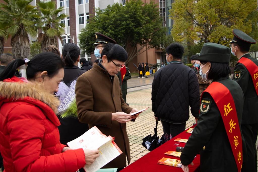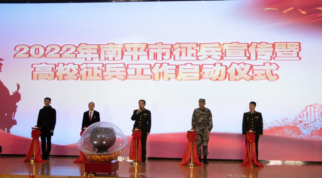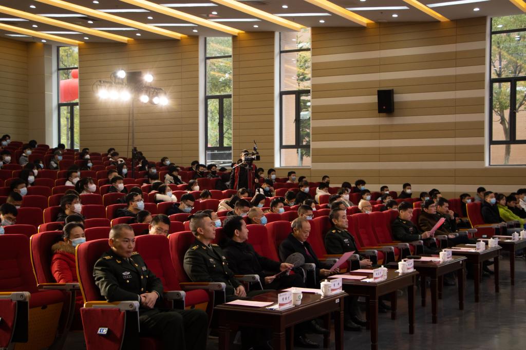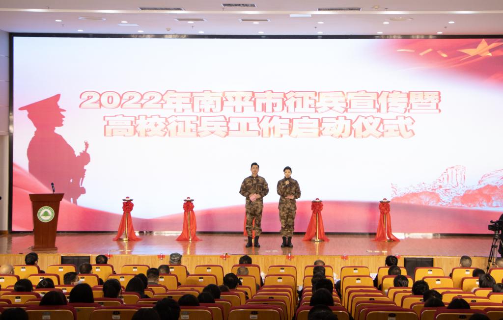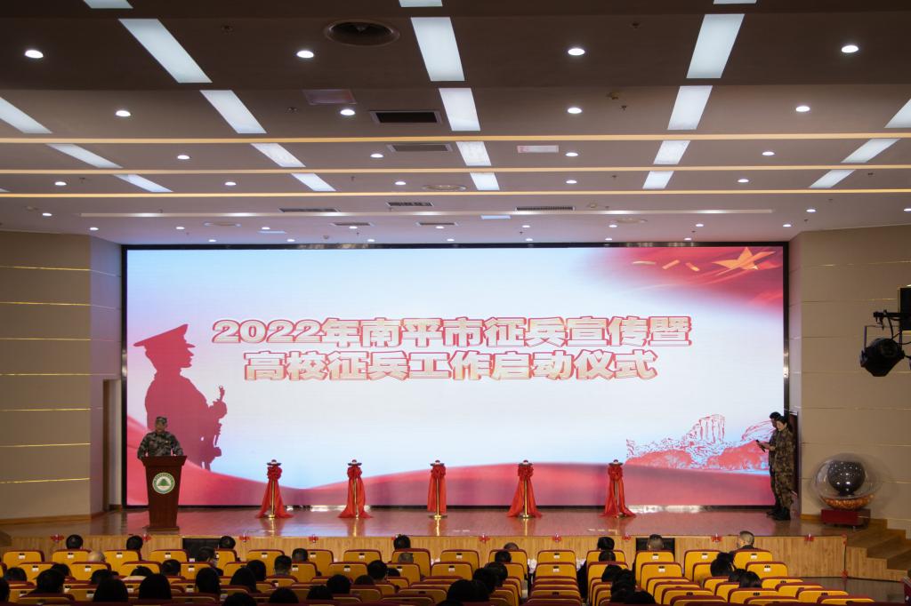 本网讯 为深入贯彻习近平强军思想,激发广大青年学子从军报国热情,扩大征兵宣传影响力和辐射面,12月29日,由南平市征兵办组织开展的“携笔从戎·不负韶华”征兵宣传暨高校征兵工作启动仪式在我院举行,标志着2022年南平市征兵工作全面展开。南平市军分区大校政委聂汉勋,我院党委书记万泉,南平市军分区大校副司令员蒋树兵,闽北职业技术学院副书记陶金辉,我院副院长谢金生,延平区副区长杨志华,南平军分区动员处上校处长李璜,南平军分区政工处上校主任郑林旋,延平区人武部上校部长李顺才出席了启动仪式,我院各系党总支书记、学生科长、辅导员及来自我院、闽北职业技术学院的300余名师生代表参加了启动仪式。