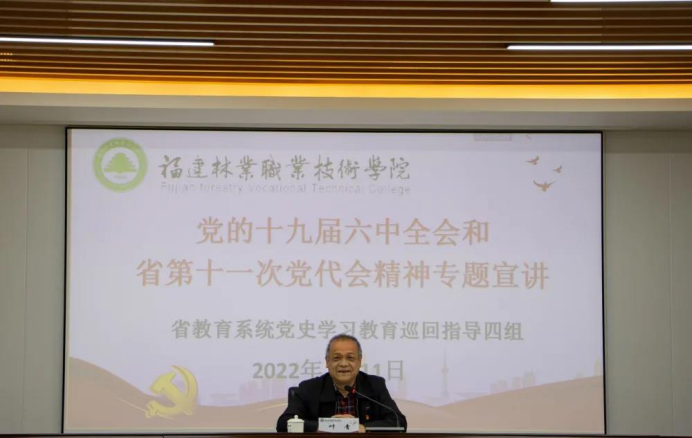 本网讯 党的十九届六中全会和省第十一次党代会召开后,全院上下都掀起了学习党的十九届六中全会和省第十一次党代会精神的热潮。为进一步深化学习,1月11日,福建省教育系统党史学习教育巡回指导四组到我院开展党的十九届六中全会和省第十一次党代会精神专题宣讲报告会。福建省教育系统党史学习教育巡回指导四组副组长、福建农林大学正处级干部叶青,福州大学统战部副部长高磐,福建教育学院办公室科员林木子出席报告会。