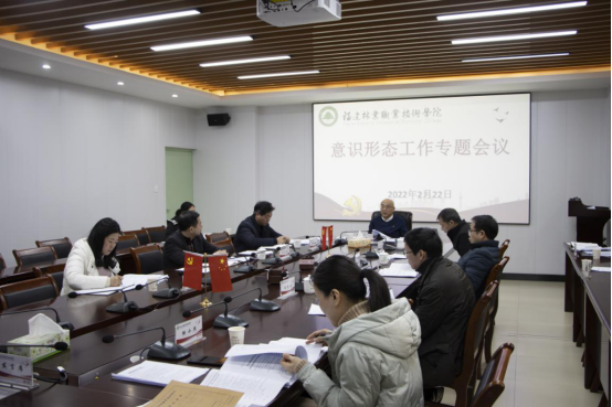 本网讯 2022年2月22日,学院党委在江南校区办公楼第一会议室召开意识形态工作专题会议,通报2021年意识形态工作专项督查情况,总结学院2021年意识形态工作,研究部署2022年意识形态工作。全体院党委委员及党政办主任参加了会议,会议由学院党委书记万泉主持。