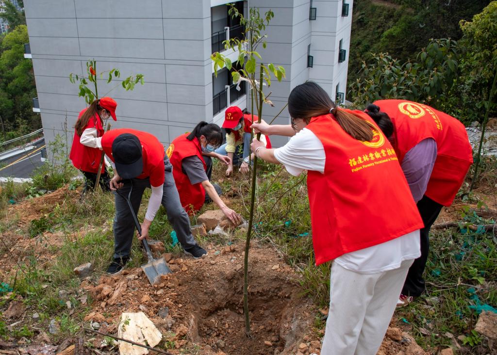 主题党日活动启动仪式上,院党委书记万泉在动员讲话中指出,学院是全国绿化模范单位,过去的五年里,学院投资60万元完成天麟校区环城路造林绿化35亩;投资300万元完成江南校区龙景山造林绿化和森林抚育36亩;投资16万元改造马尾松林45亩;投资110万建成2个校区安全步道1.1千米;森林资源总量稳步提升,校园环境大幅度改善。未来,学院还将主动对接国家和福建省发展战略,开设碳中和通识课程,将碳中和理念与实践融入人才培养体系,着力提升科技创新能力和创新人才培养水平,为碳达峰、碳中和工作提供科技支撑和人才保障。