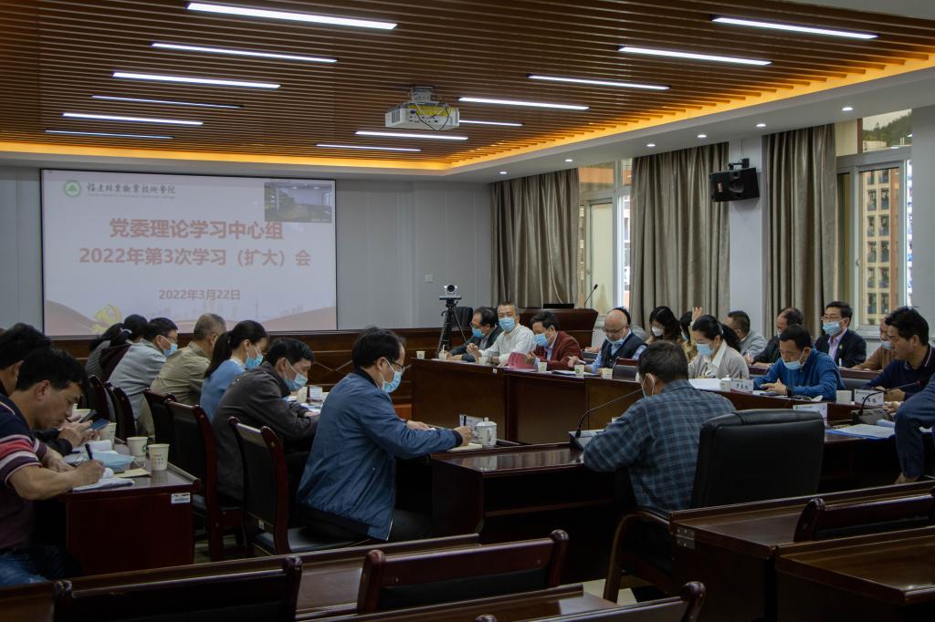 本网讯 2022年3月22日下午,按照院党委安排部署,院党委书记万泉在江南校区行政楼6楼视频会议室主持召开2022年第3次党委理论学习中心组学习(扩大)会议。天麟校区经管楼四楼视频会议室设分会场。院党委委员、各系党总支书记、各机关处室党支部书记、各部门负责人参加学习。