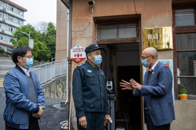 院党委书记万泉、纪委书记林建斌仔细询问门卫校门管理情况
