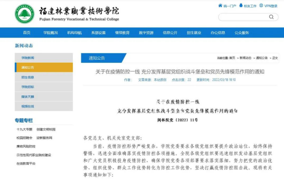 福建林职院在疫情防控责任上落实落细,确保各部门责任到位,落实到位,管理有方案,方案有落实,把好摸排、入口、检测、防护、宣传五道关,推动疫情防控各项工作有序开展。