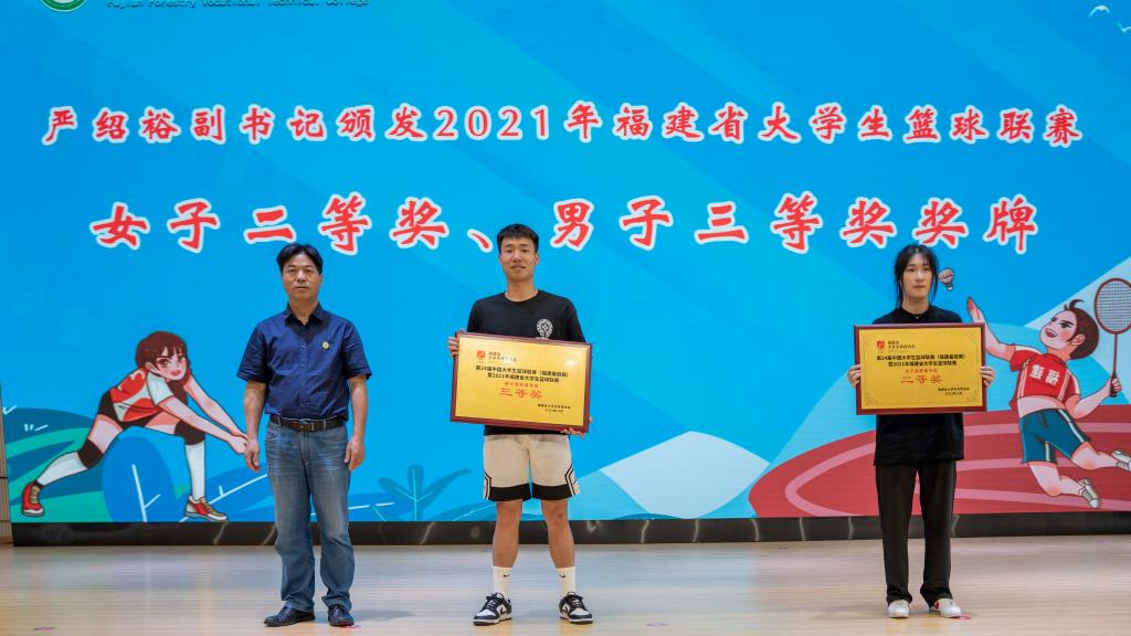 大会上,严绍裕副书记颁发了2021年福建省大学生篮球联赛女子二等奖、男子三等奖奖牌。