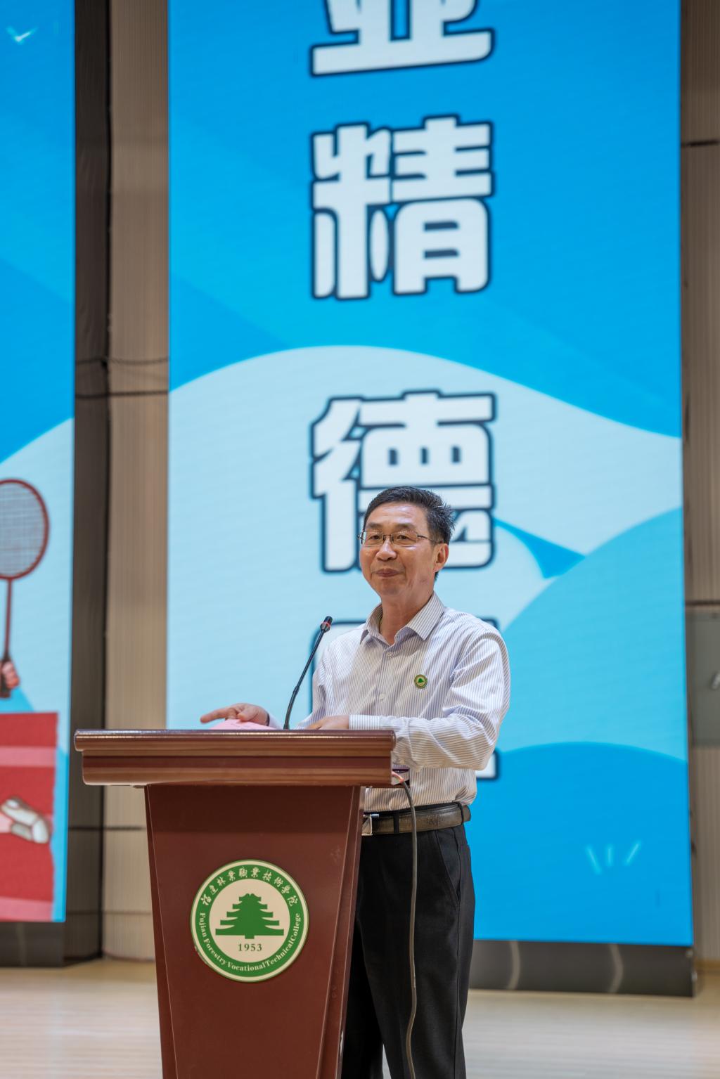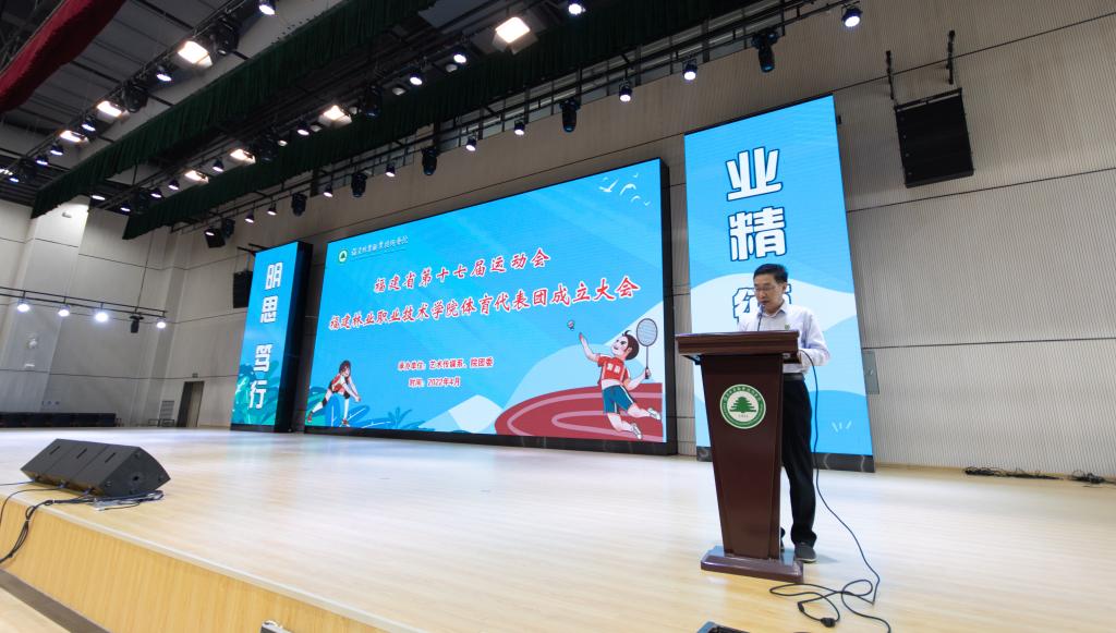 本网讯 福建省第十七届运动会将在南平市举行。从5月份开始,福建省第十七届运动会大学生部的比赛即将拉开帷幕。为了弘扬体育文化、传承体育精神、提升体育水平,激励同学们积极备战和参加省运会,2022年4月26日下午,福建省第十七届运动会福建林业职业技术学院体育代表团成立大会在学院江南校区体育馆举行。院党委书记万泉,院党委副书记、院长刘文开,院党委副书记严绍裕,副院长罗立仪出席成立大会。体育代表团领导小组成员,各系党总支书记及教师、教练员、运动员、学生代表共计300余人参加此次大会。会议由学院副院长李肇锋主持。