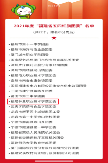 本网讯 青春心向党,建功新时代。为表彰先进,激励各级团组织和广大团员青年、团干部奋发有为、再创佳绩,发挥先锋模范作用,共青团福建省委员会决定表彰全省五四红旗团委(团支部)、全省优秀共青团员、全省优秀共青团干部。我院荣获“福建省五四红旗团委”称号。在中国共青团成立100周年和党的二十大即将召开之际,该项荣誉的获得,是团省委对我院共青团工作的肯定,也是学院立德树人的重要成果。