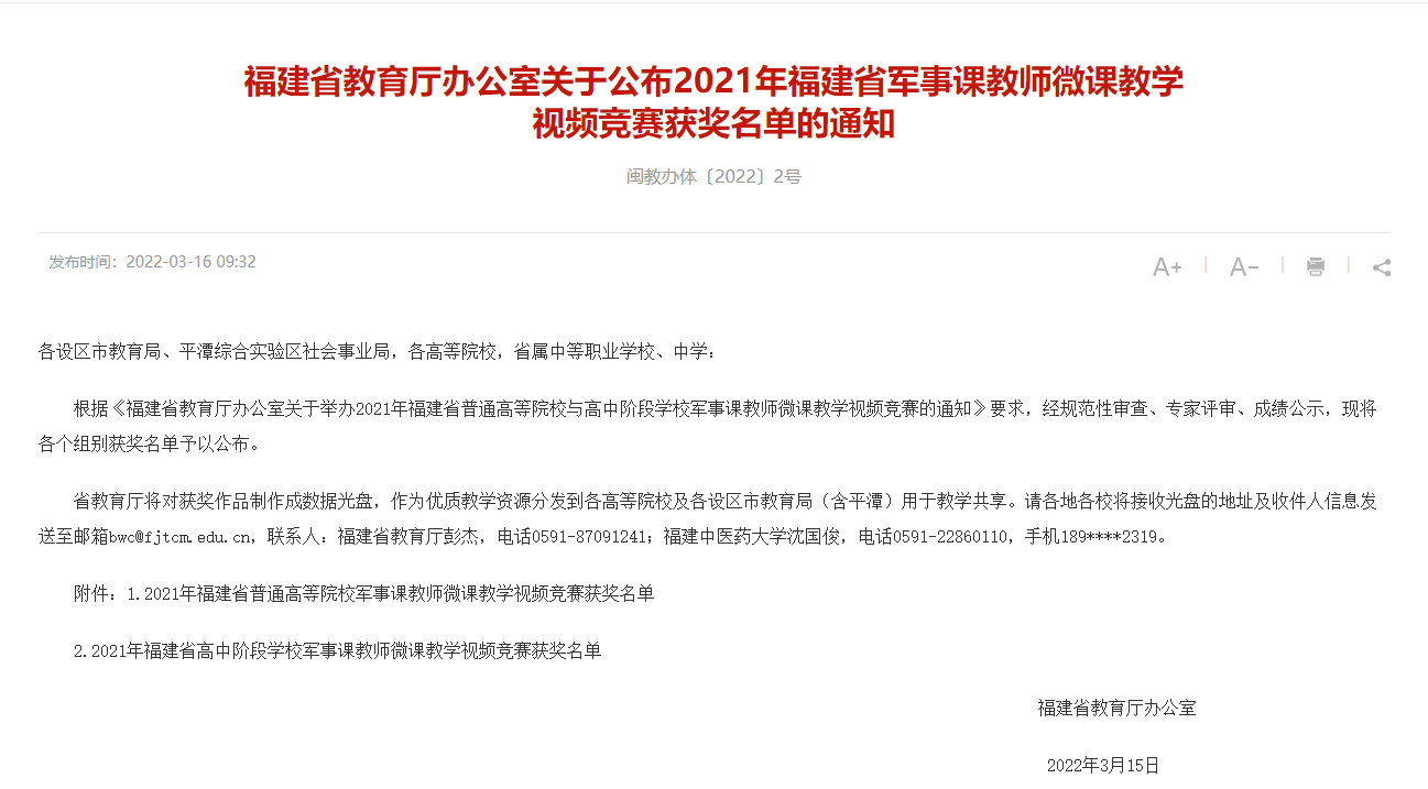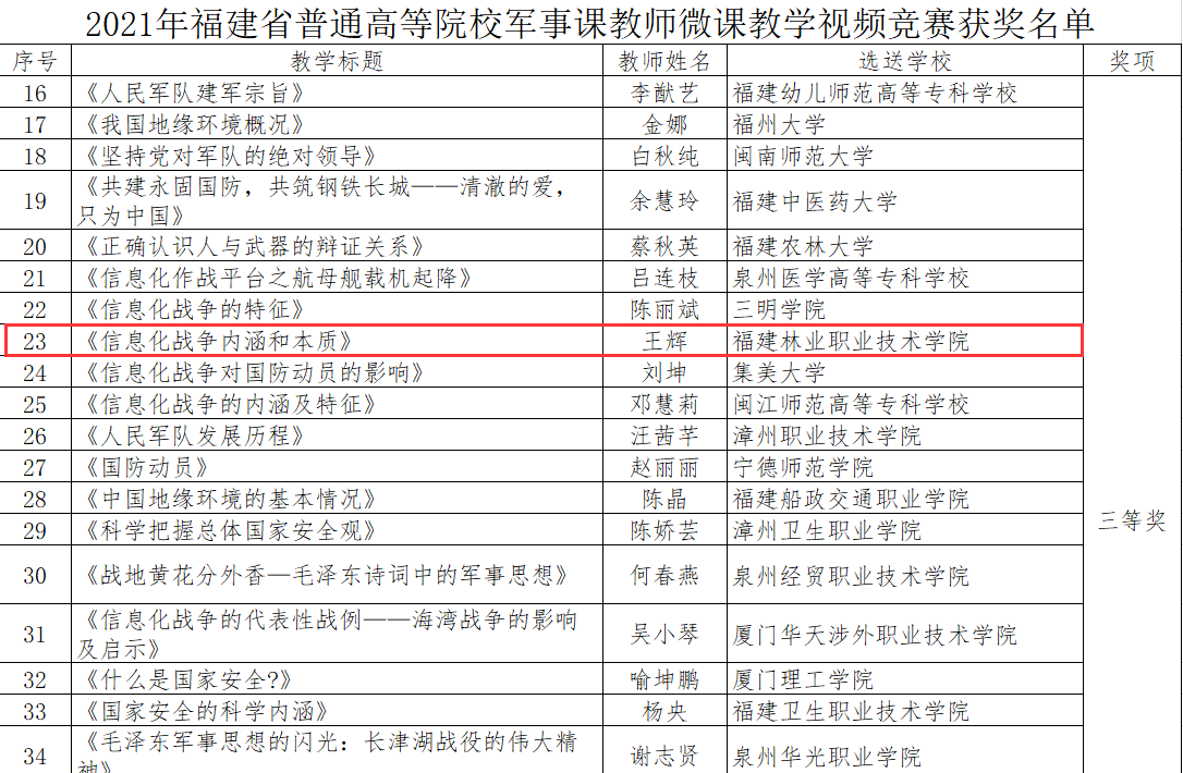 本网讯 近日,福建省教育厅公布2021年福建省军事课教师微课教学视频竞赛获奖名单。我院信息工程系王辉老师的参赛作品脱颖而出,荣获普通高等院校组三等奖。